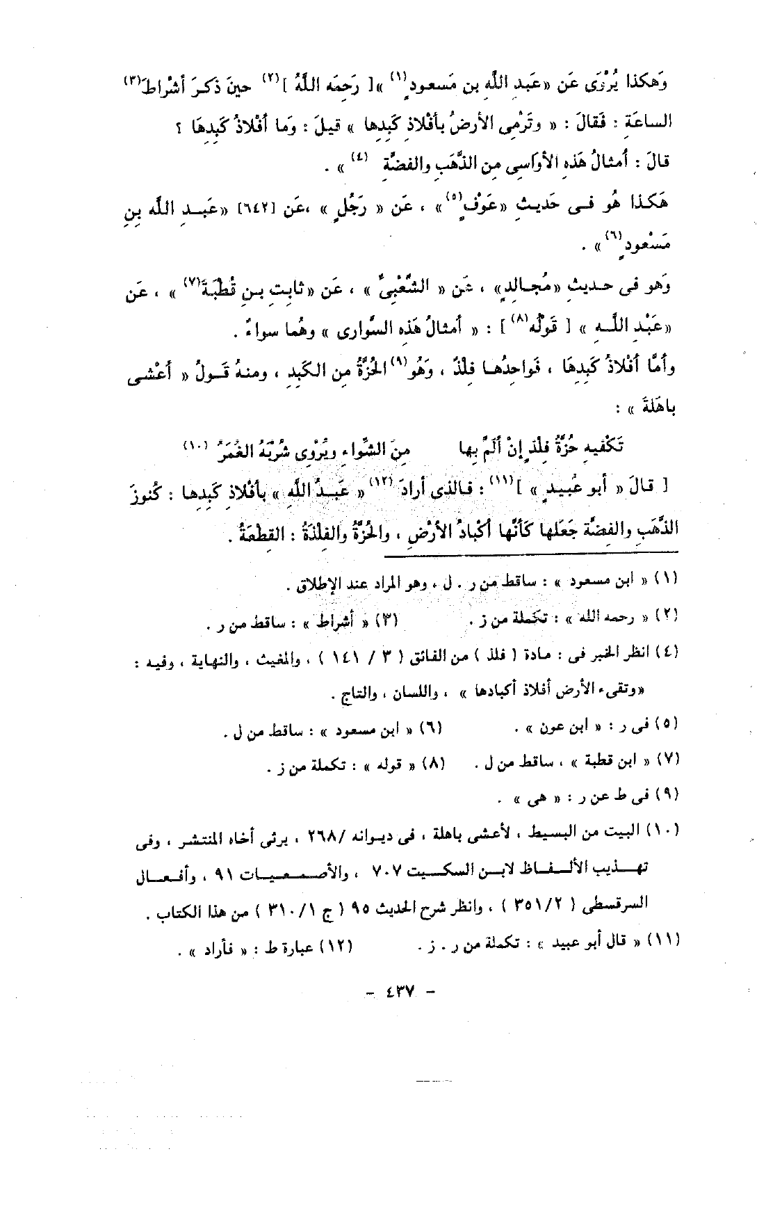 وهكذا يروى عن «عبد الله بن مسعود» [رحمه الله] حين ذكر أشراط الساعة: فقال: «وترمى الأرض بأفلاذ كبدها» قيل: وما أفلاذ كبدها؟