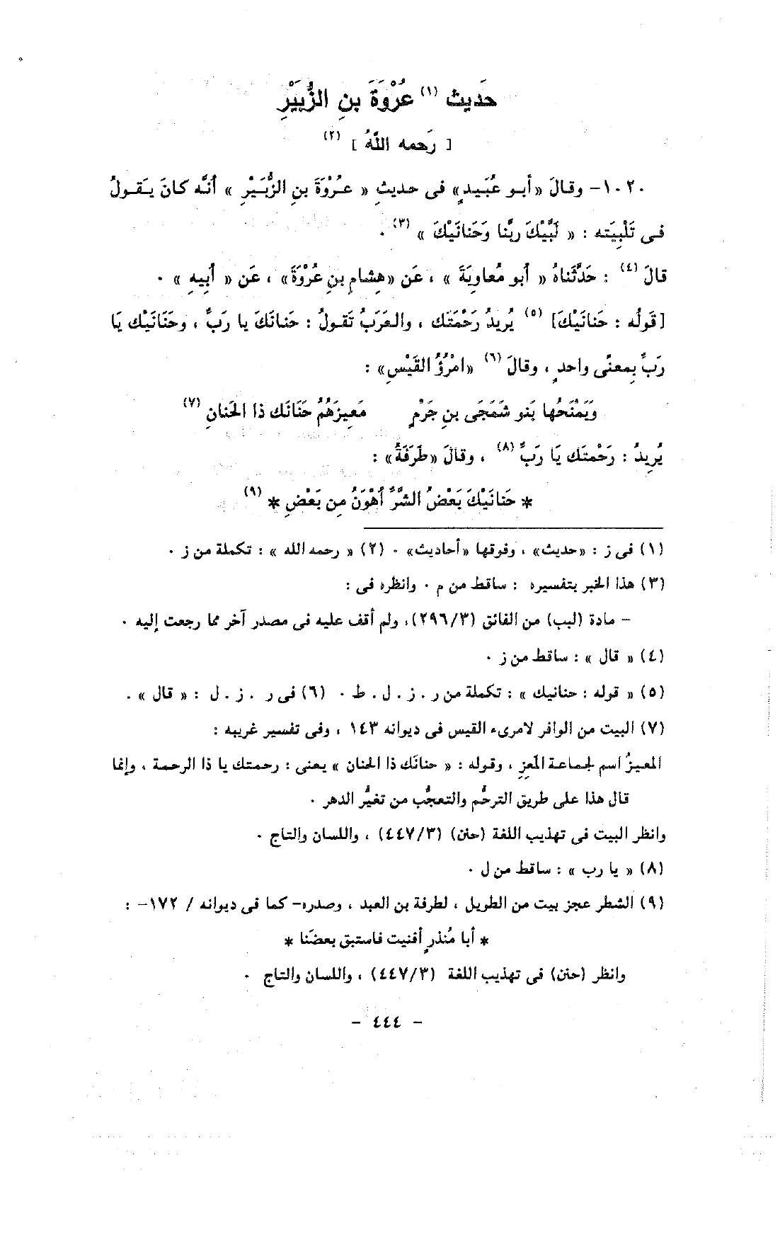 1020 - وقال «أبو عبيد» فى حديث «عروة بن الزبير» أنه كان يقول في تلبيته: «لبيك ربنا وحنانيك».