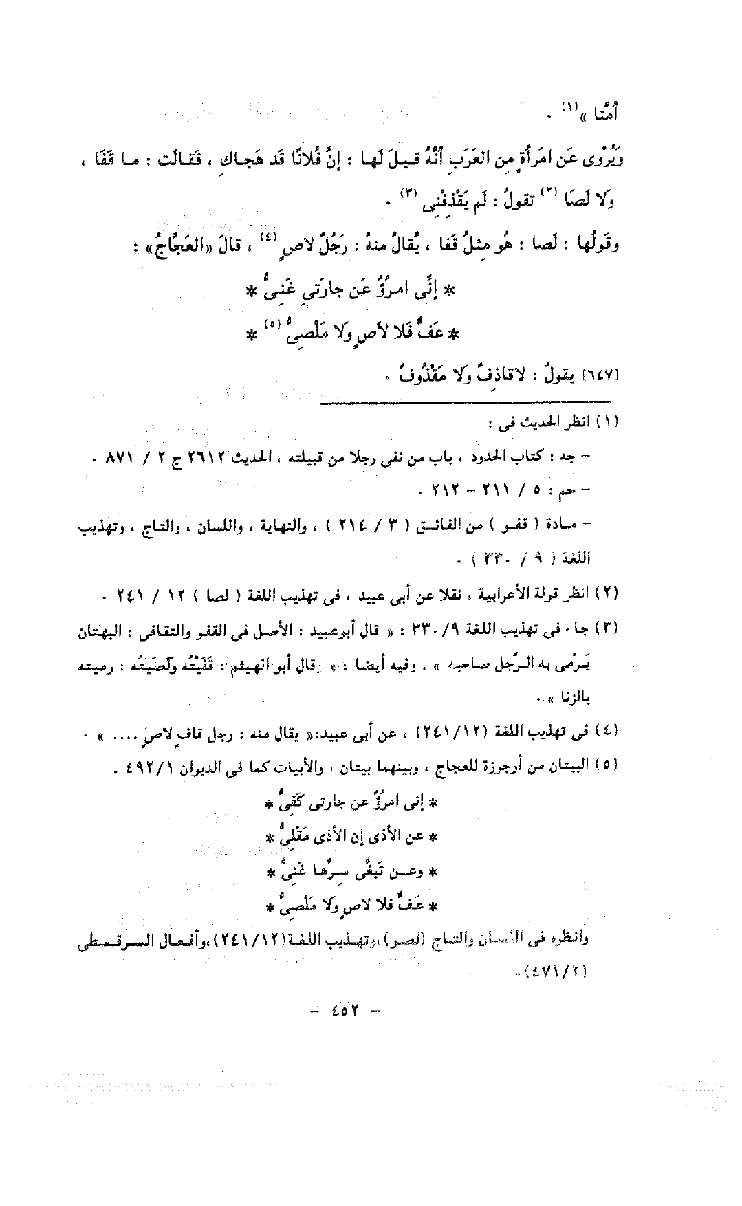 ويروى عن امرأة من العرب أنه قيل لها: إن فلانًا قد هجاك, فقالت: ما قفا, ولا لصا تقول: لم يقذفنى.