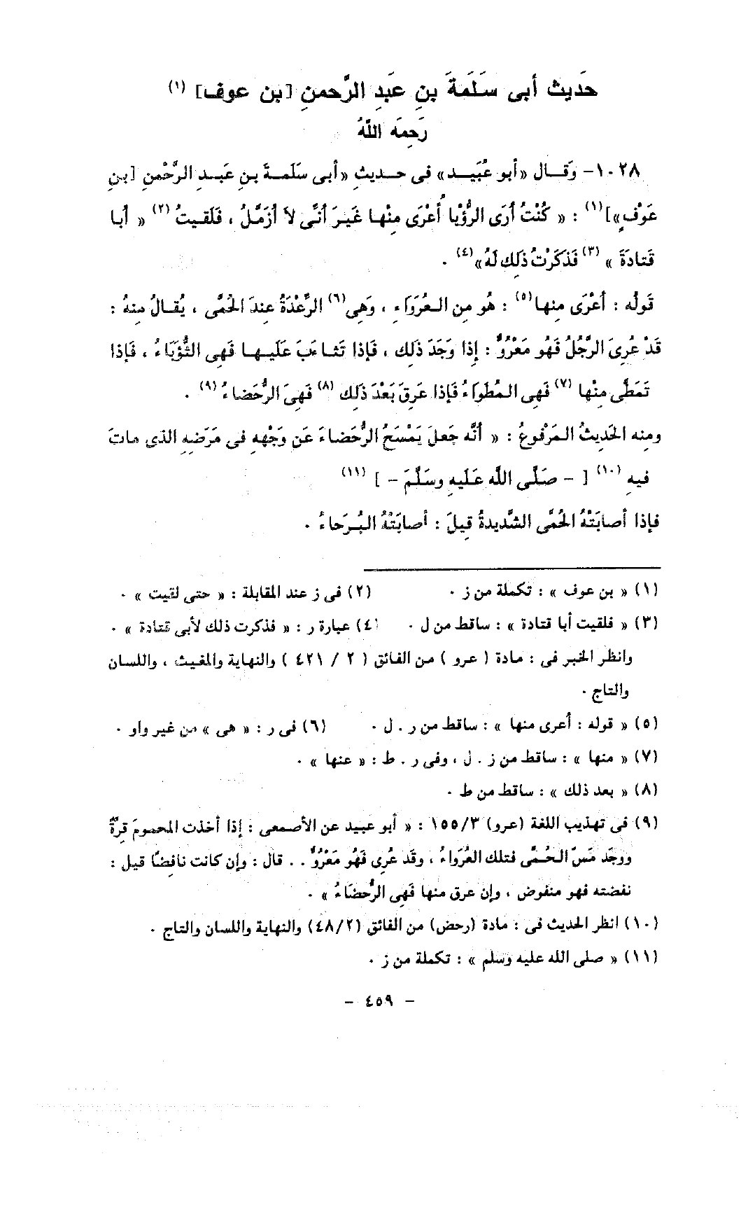 1028 - وقال «أبو عبيد» فى حديث «أبى سلمة بن عبد الرحمن [بن عوف»]: «كنت أرى الرؤيا أعرى منها غير أنى لا أزمل, فلقيت «أبا قتادة» فذكرت ذلك له».