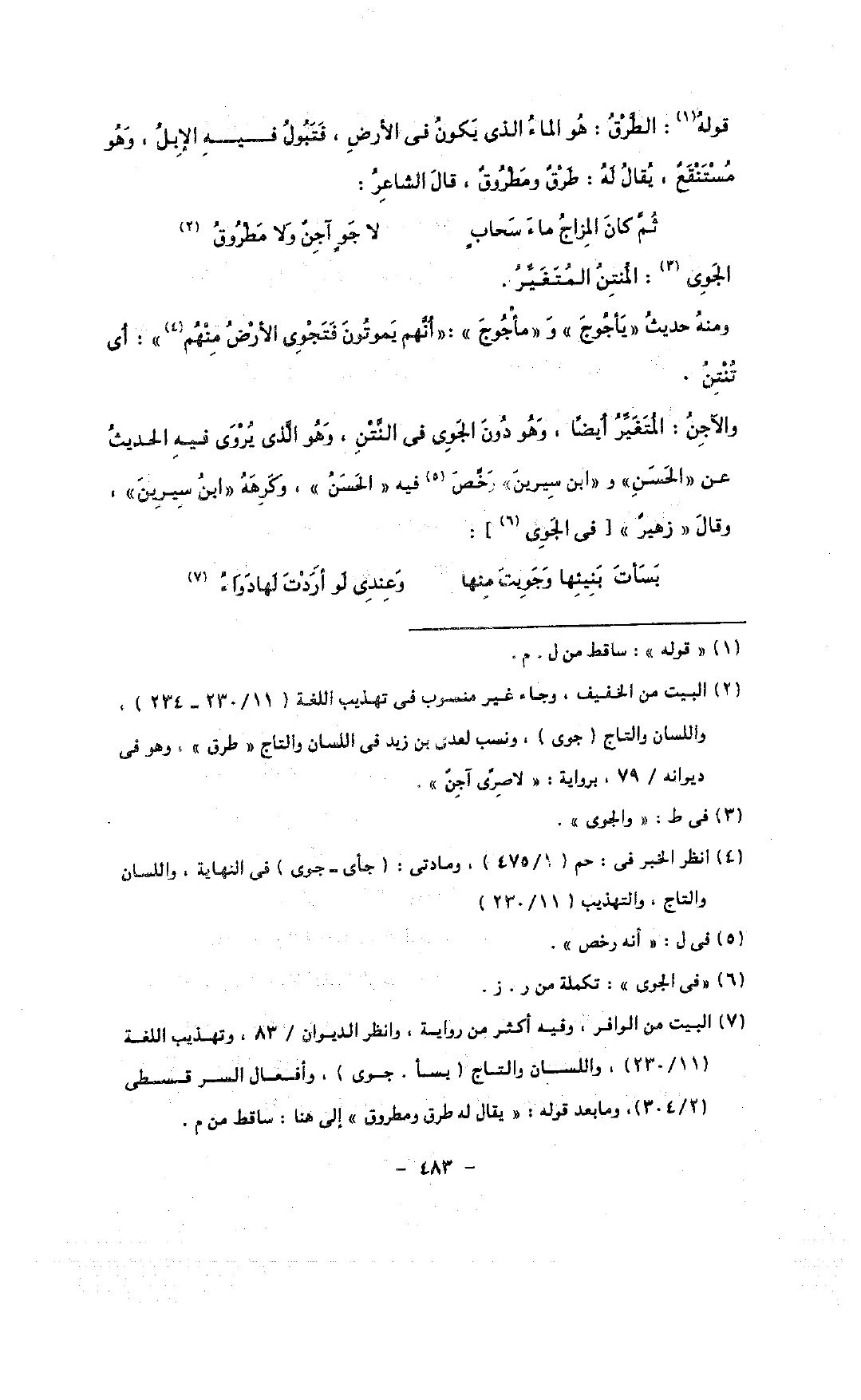 والآجن: المتغير أيضًا, وهو دون الجوى في النتن, وهو الذى يروى فيه الحديث عن «الحسن» و «ابن سيرين» رخص فيه «الحسن» , وكرهه «ابن سيرين» , وقال «زهير» [فى الجوى]: