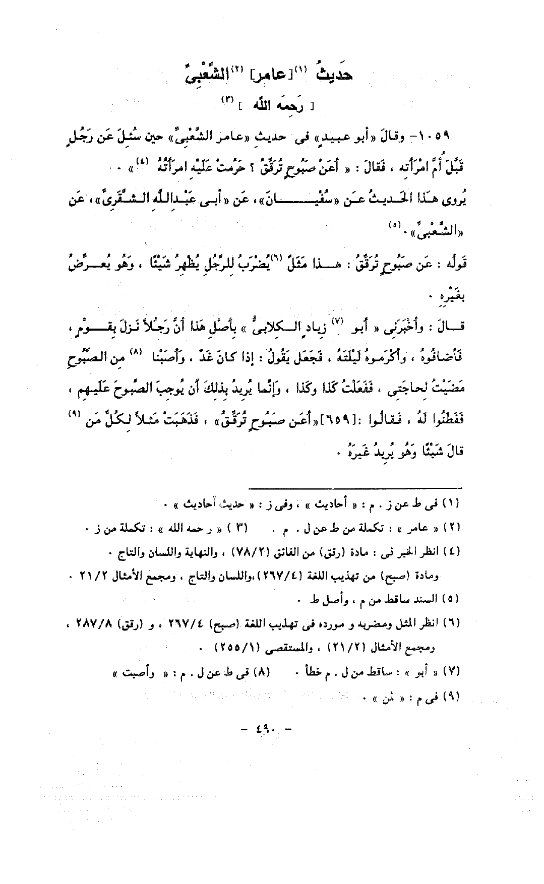 1059 - وقال «أبو عبيد» فى حديث «عامر الشعبى» حين سئل عن رجل قبل أم امرأته, فقال: «أعن صبوح ترقق؟ حرمت عليه امرأته».