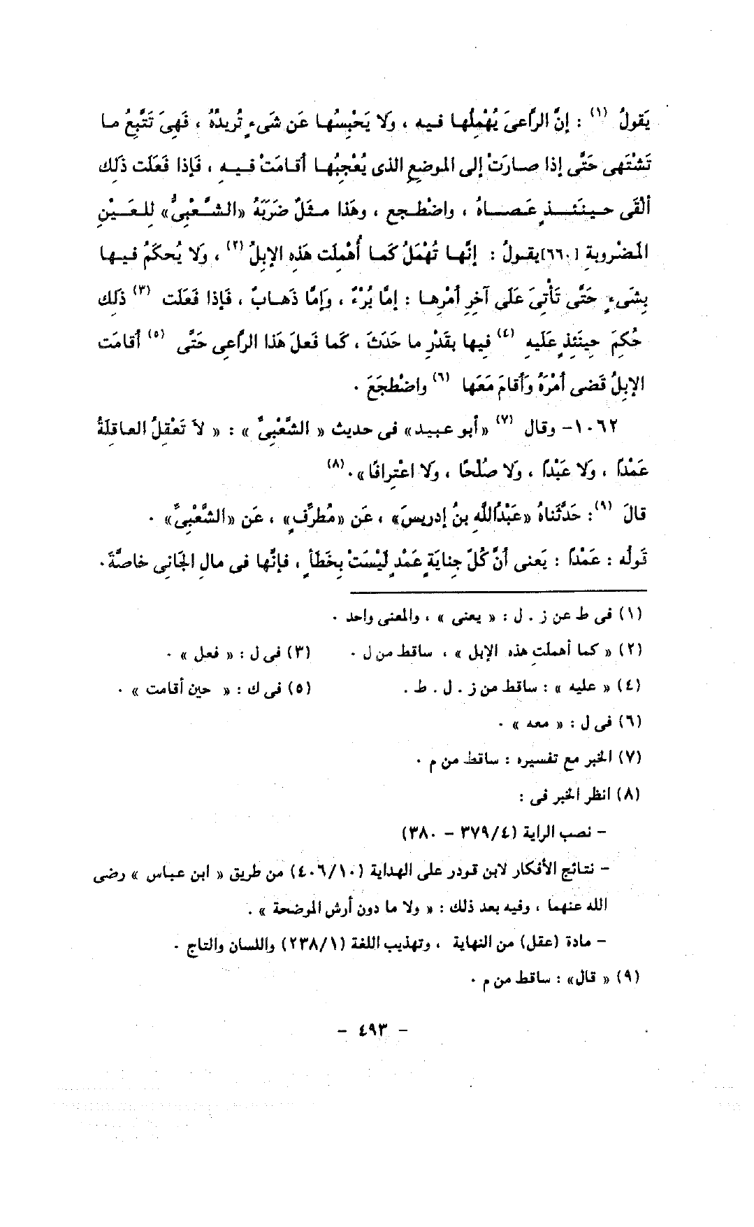 يقول: إن الراعى يهملها فيه, ولا يحبسها عن شئ تريده, فهى تتبع ما تشتهى حتى إذا صارت إلى الموضع الذى يعجبها أقامت فيه, فإذا فعلت ذلك ألقى حينئذ عصاه, واضطجع, وهذا مثل ضربة «الشعبى» للعين المضروبة [660] يقول: إنها تهمل كما أهملت هذه الإبل, ولا يحكم فيها بشئ حتى تأتى على آخر أمرها: إما برء, وإما ذهاب, فإذا فعلت ذلك حكم حينئذ عليه فيها بقدر ما حدث, كما فعل هذا الراعى حتى أقامت الإبل قضى أمره وأقام معها واضطجع.