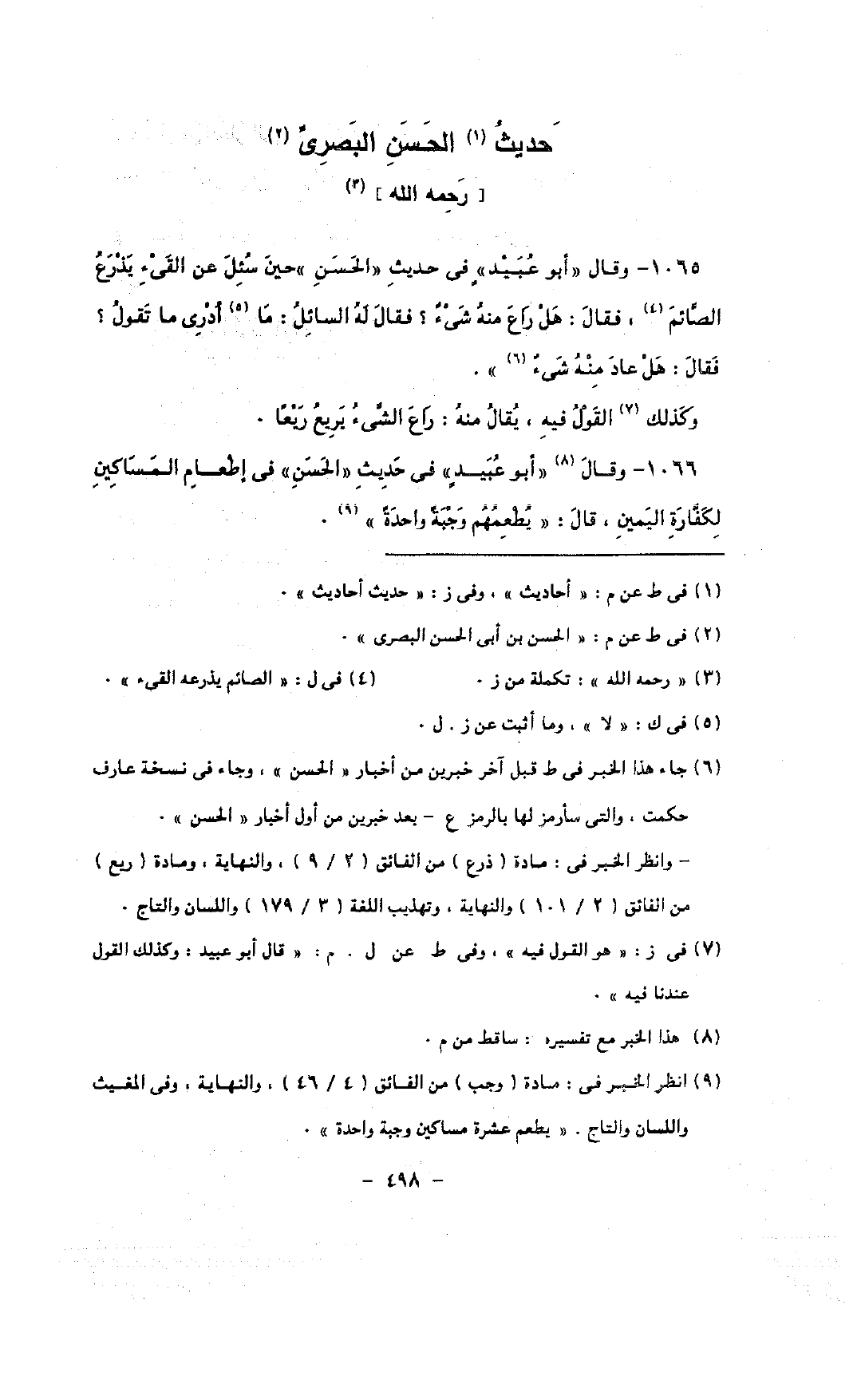 1065 - وقال «أبو عبيد» فى حديث «الحسن» حين سئل عن القئ يذرع الصائم, فقال: هل راع منه شئ؟ فقال له السائل: ما أدرى ما تقول؟