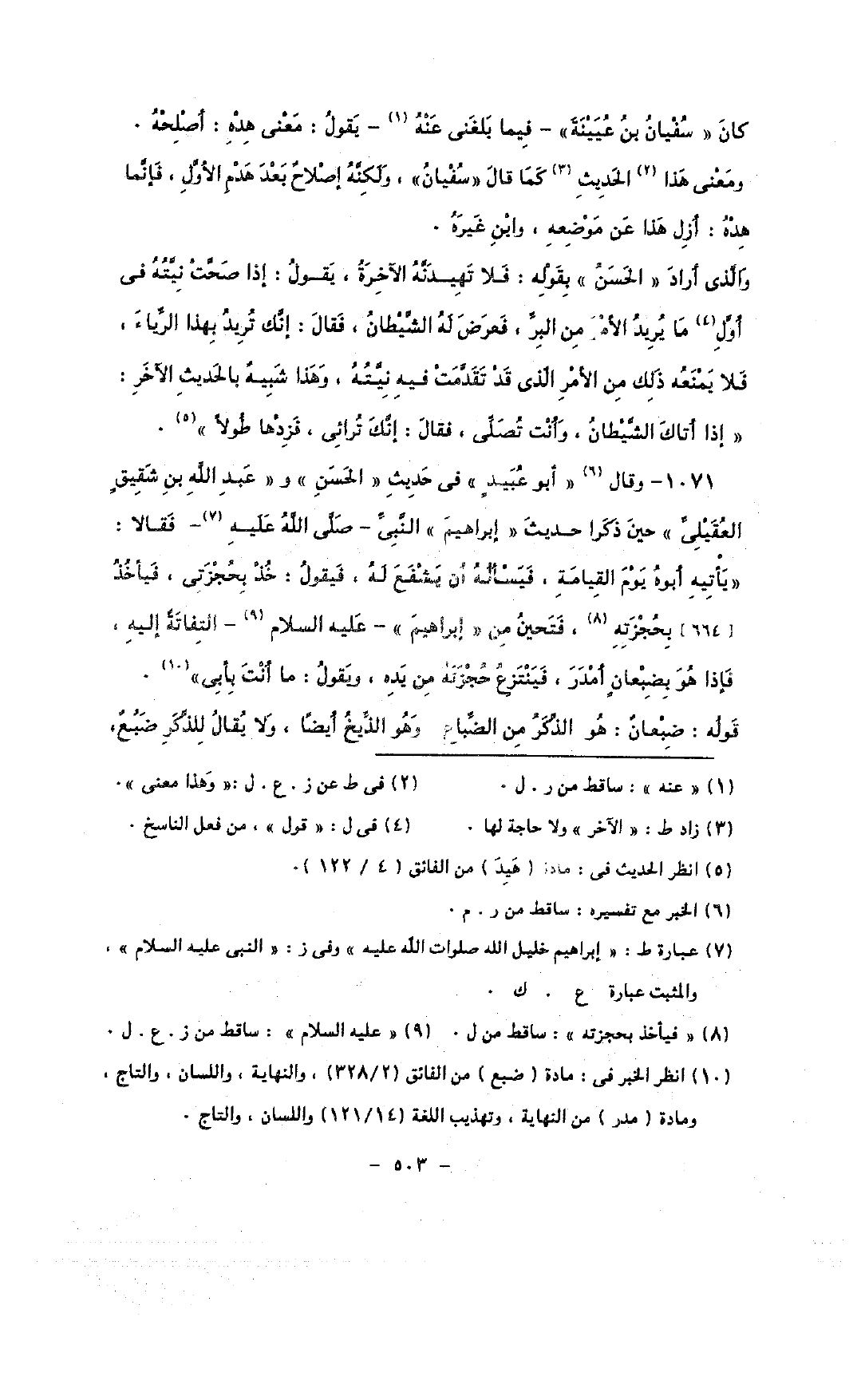 1071 - وقال «أبو عبيد» فى حديث «الحسن» و «عبد الله بن شقيق العقيلى» حين ذكرا حديث «إبراهيم» النبى - صلى الله عليه - فقالا: «يأتيه أبوه يوم القيامة, فيسأله أن يشفع له, فيقول: خذ بحجزتى, فيأخذ [664] بحجزته, فتحين من «إبراهيم» - عليه السلام - التفاته إليه, فإذا هو بضبعان أمدر, فينتزع حجزته من يده, ويقول: ما أنت بأبى».