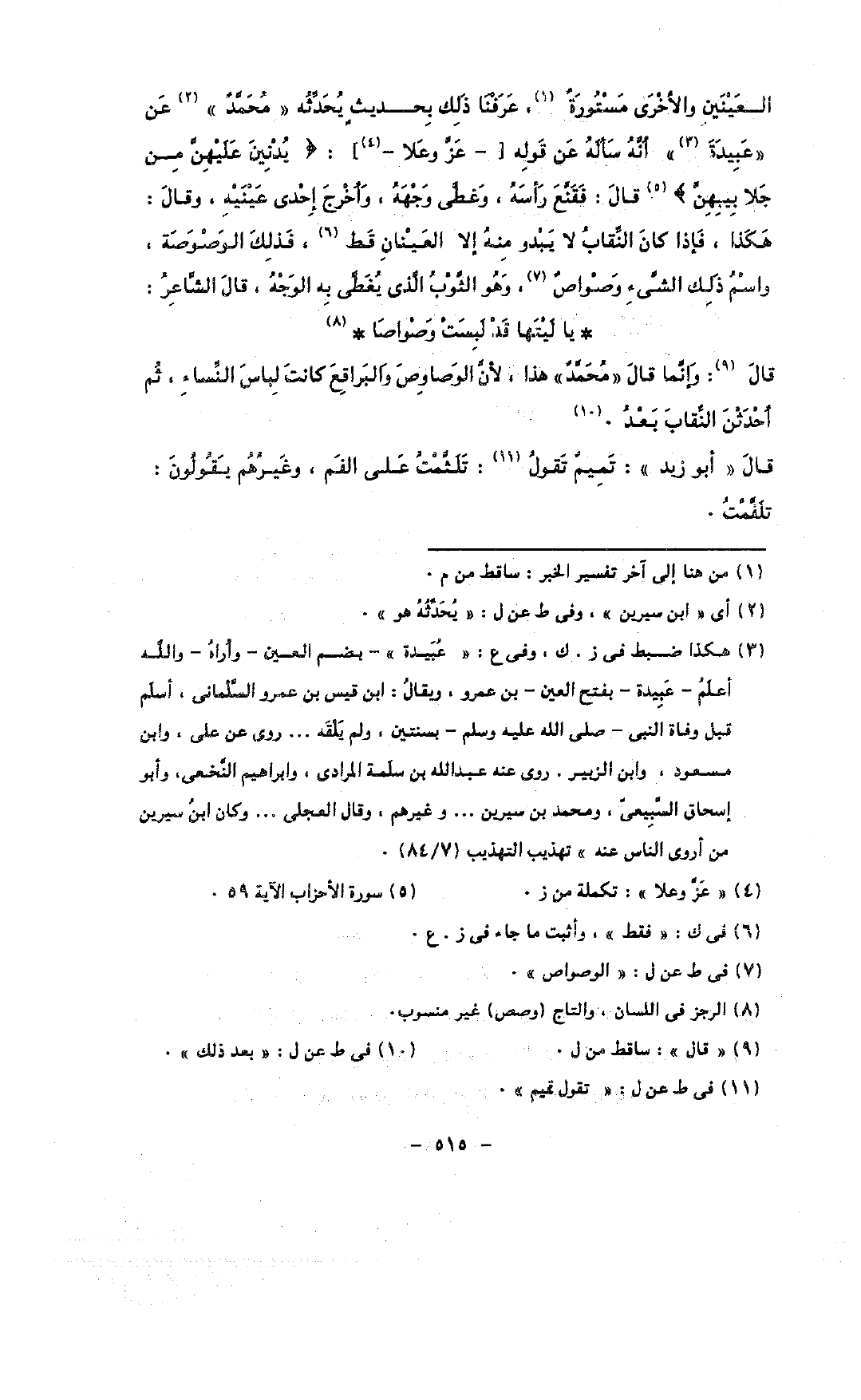 العينين والأخرى مستورة, عرفنا ذلك بحديث يحدثه «محمد» عن «عبيدة» أنه سأله عن قوله [- عز وعلا -]: {يدنين عليهن من جلابيبهن} قال: فقنع رأسه, وغطى وجهه, وأخرج إحدى عينيه, وقال: هكذا, فإذا كان النقاب لا يبدو منه إلا العينان قط, فذلك الوصوصة, واسم ذلك الشئ وصواص, وهو الثوب الذى يغطى به الوجه, قال الشاعر: