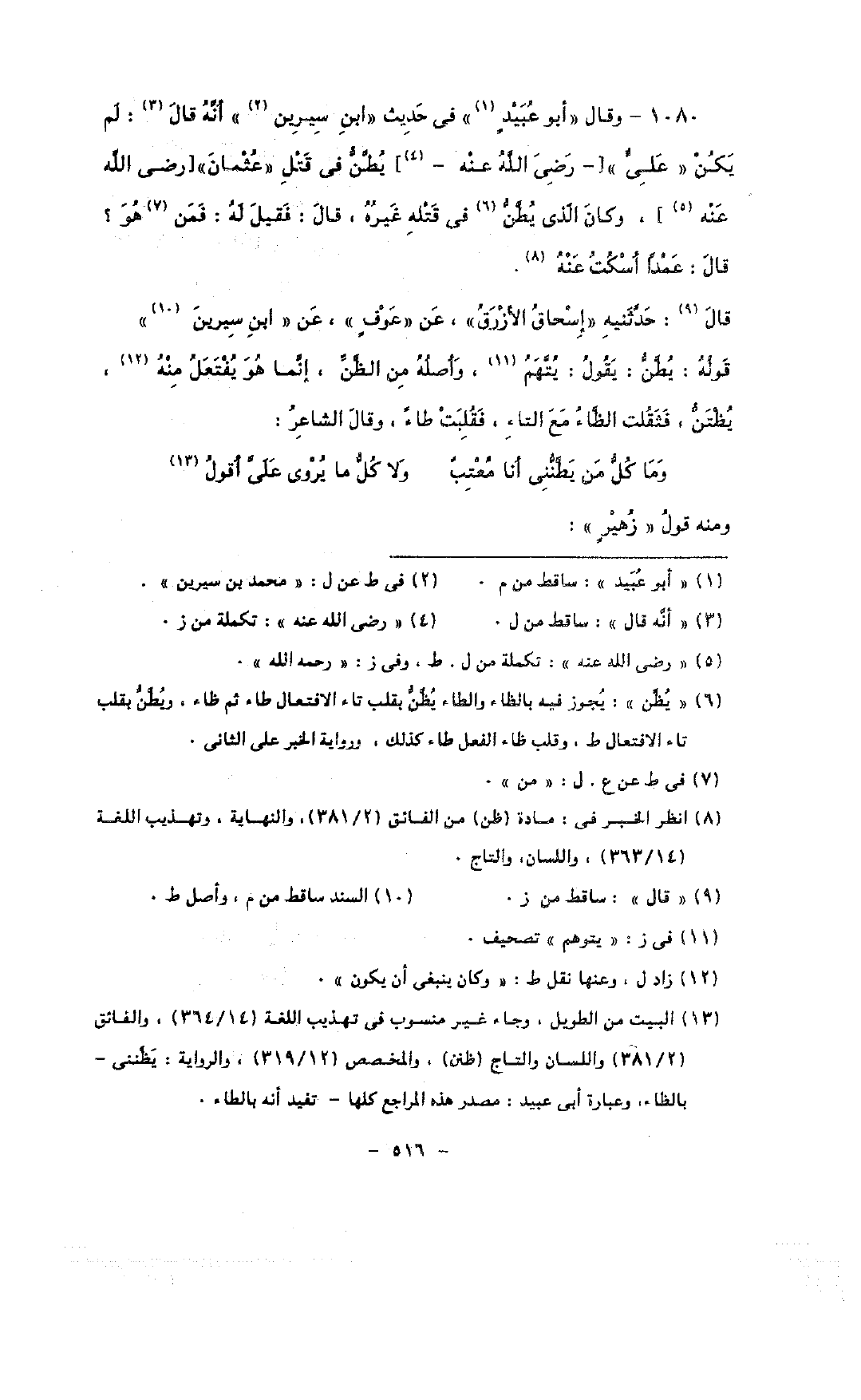 1080 - وقال «أبو عبيد» فى حديث «ابن سيرين» أنه قال: لم يكن «على» [- رضى الله عنه -] يطن فى قتل «عثمان» [رضى الله عنه] , وكان الذى يطن فى قتله غيره, قال: فقيل له: فمن هو؟ قال: عمدًا أسكت عنه.