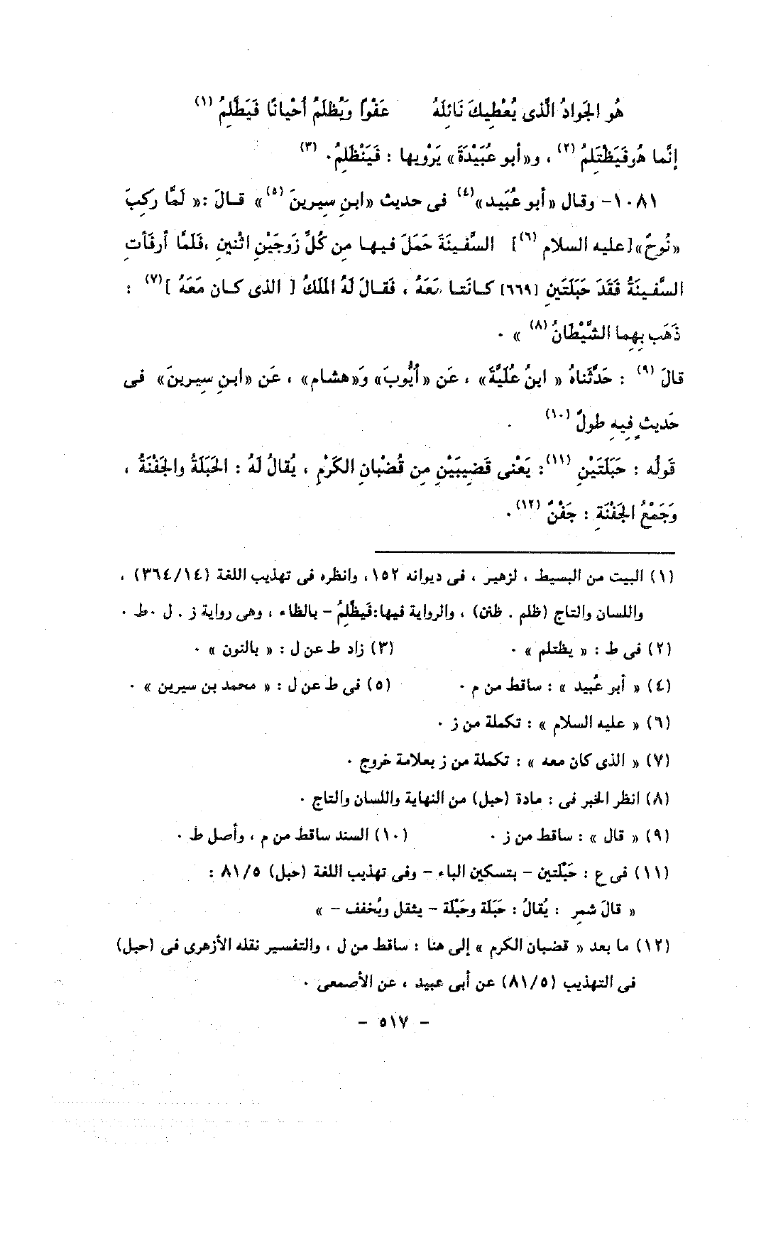 1081 - وقال «أبو عبيد» فى حديث «ابن سيرين» قال: «لما ركب «نوح» [عليه السلام] السفينة حمل فيها من كل زوجين اثنين فلما أرفأت السفينة فقد حبلتين [669] كانتا مه, فقال له الملك [الذى كان معه]: