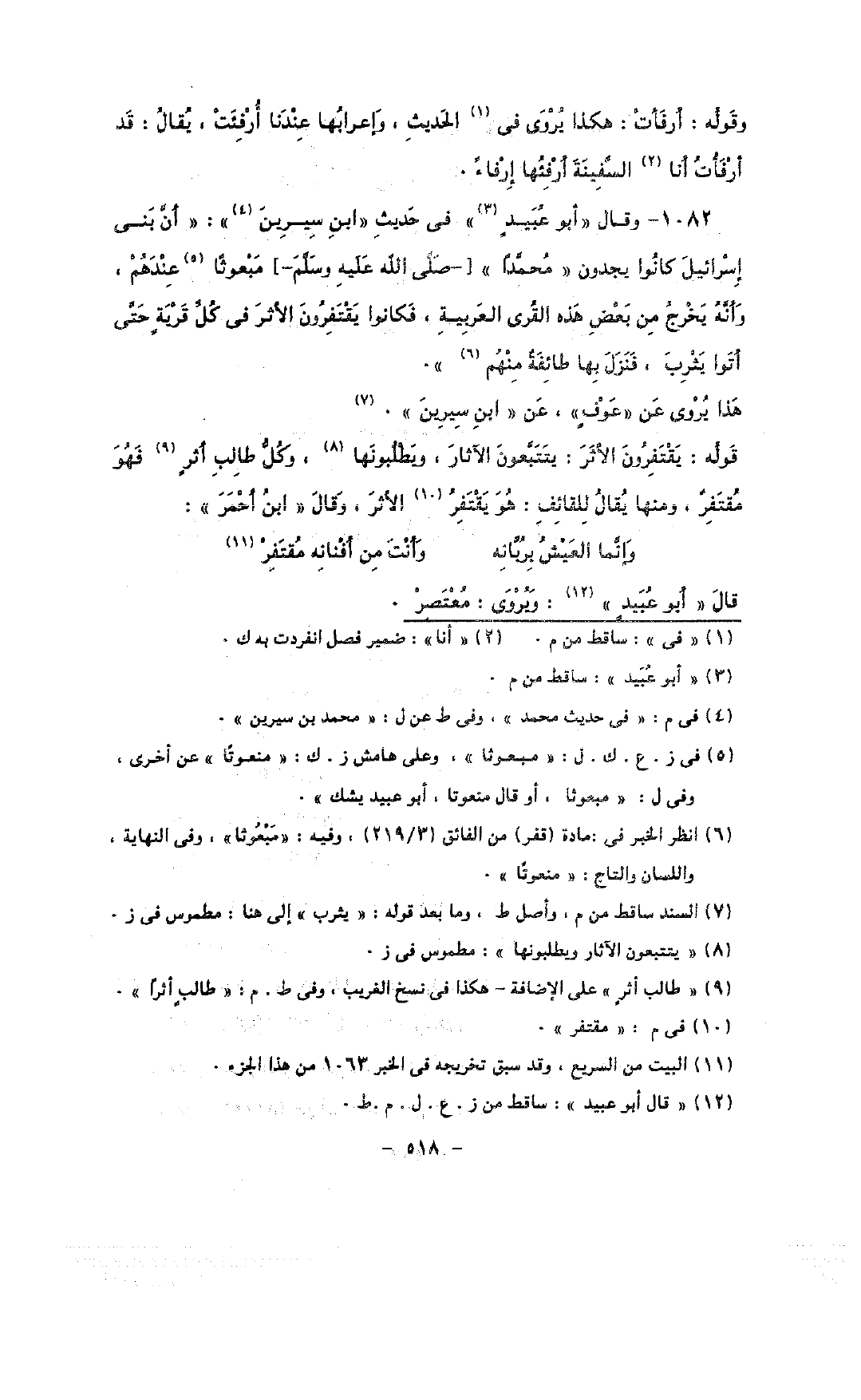 1082 - وقال «أبو عبيد» فى حديث «ابن سيرين»: «أن بنى إسرائيل كانوا يجدون «محمدًا» [- صلى الله عليه وسلم -] مبعوثًا عندهم, وأنه يخرج من بعض هذه القرى العربية, فكانوا يقتفرون الأثر فى كل قرية حتى أتوا يثرب, فنزل بها طائفة منهم».