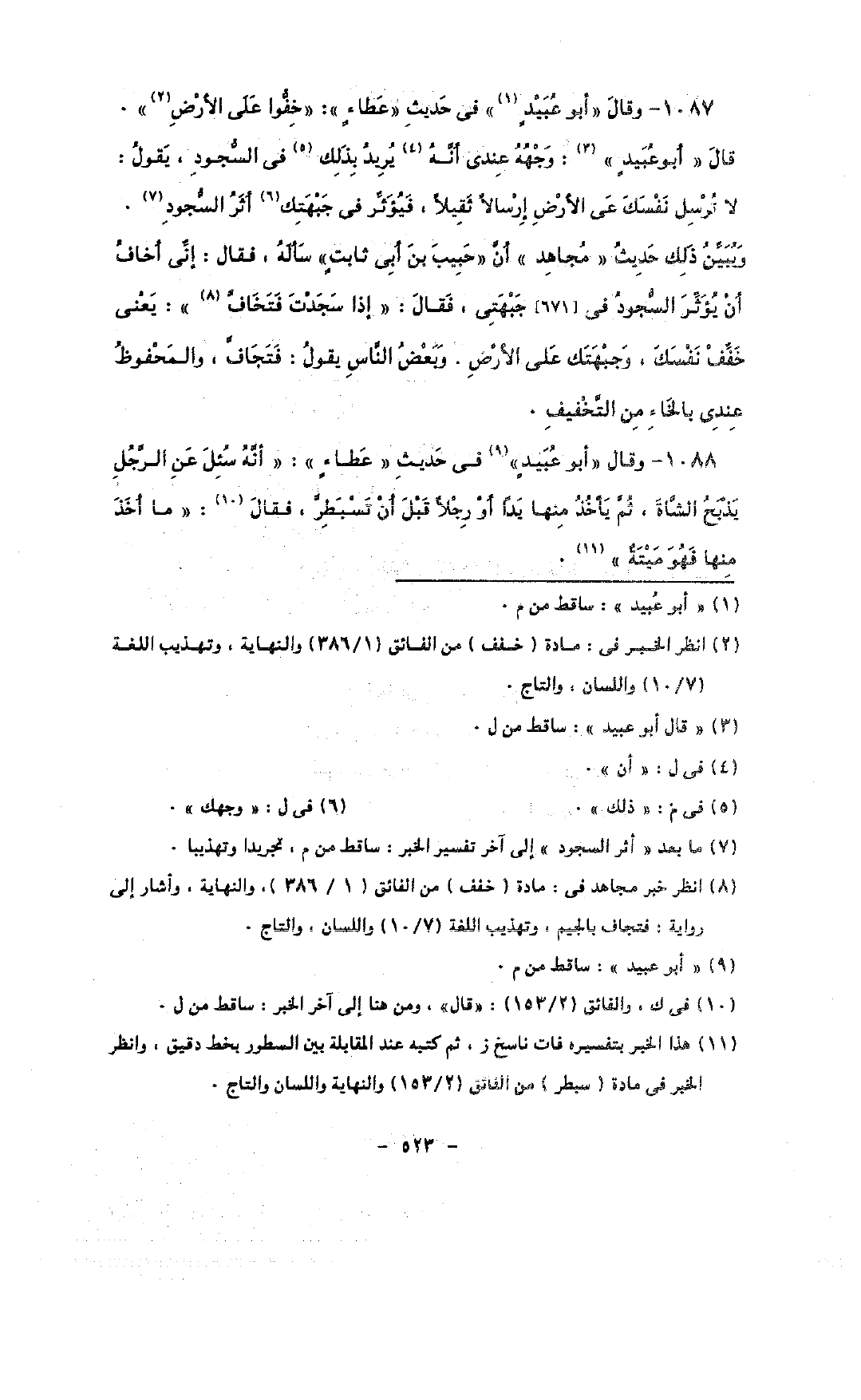 ويبين ذلك حديث «مجاهد» أن «حبيب بن أبى ثابت سأله, فقال: إني أخاف أن يؤثر السجود فى [671] جبهتى, فقال: «إذا سجدت فتخاف»: يعنى خفف نفسك, وجبهتك على الأرض. وبعض الناس يقول: فتجاف, والمحفوظ عندى بالخاء من التخفيف.