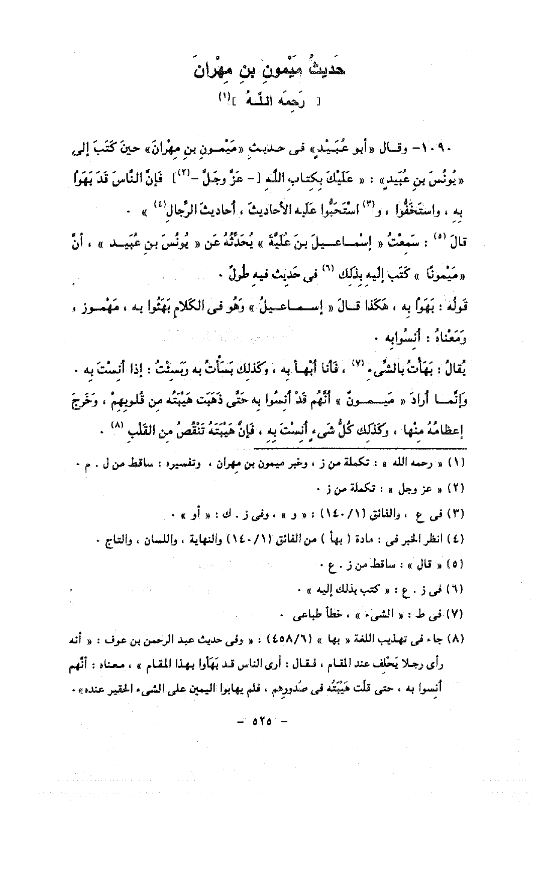 1090 - وقال «أبو عبيد» فى حديث «ميمون بن مهران» حين كتب إلى «يونس بن عبيد»: «عليك بكتاب الله [- عز وجل -] فإن الناس قد بهوا به, واستخفوا, واستحبوا عليه الأحاديث, أحاديث الرجال».