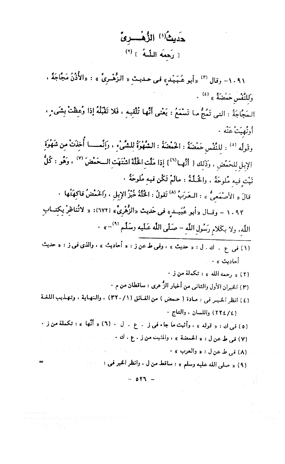 1092 - وقال «أبو عبيد» فى حديث «الزهرى» [672]: «لا تناظر بكتاب الله, ولا بكلام رسول الله - صلى الله عليه وسلم -».