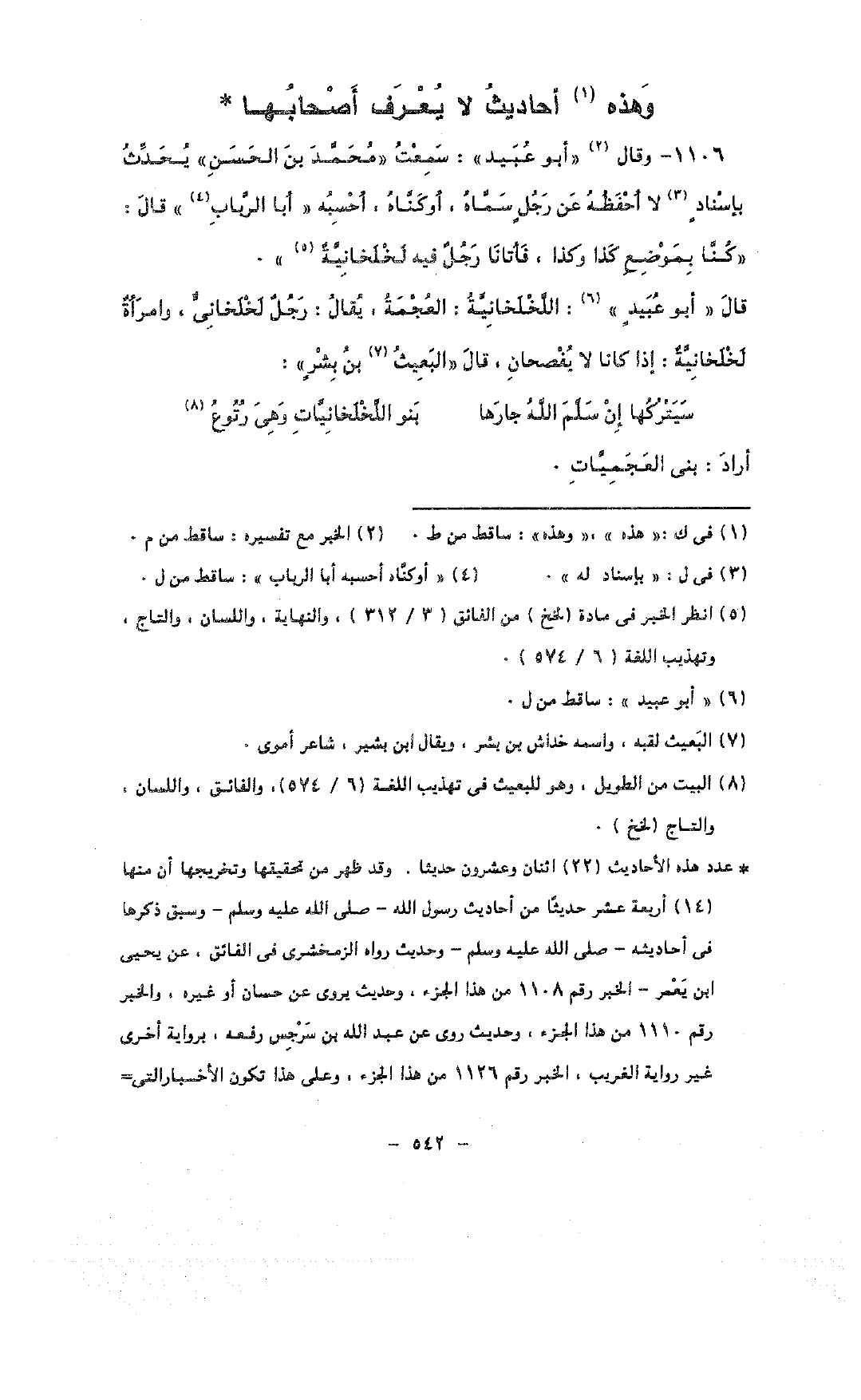 1106 - وقال «أبو عبيد»: سمعت «محمد بن الحسن» يحدث بإسناد لا أحفظه عن رجل سماه, أو كناه, أحسبه «أبا الرباب» قال: «كنا بموضع كذا وكذا, فأتانا رجل فيه لخلخانية».