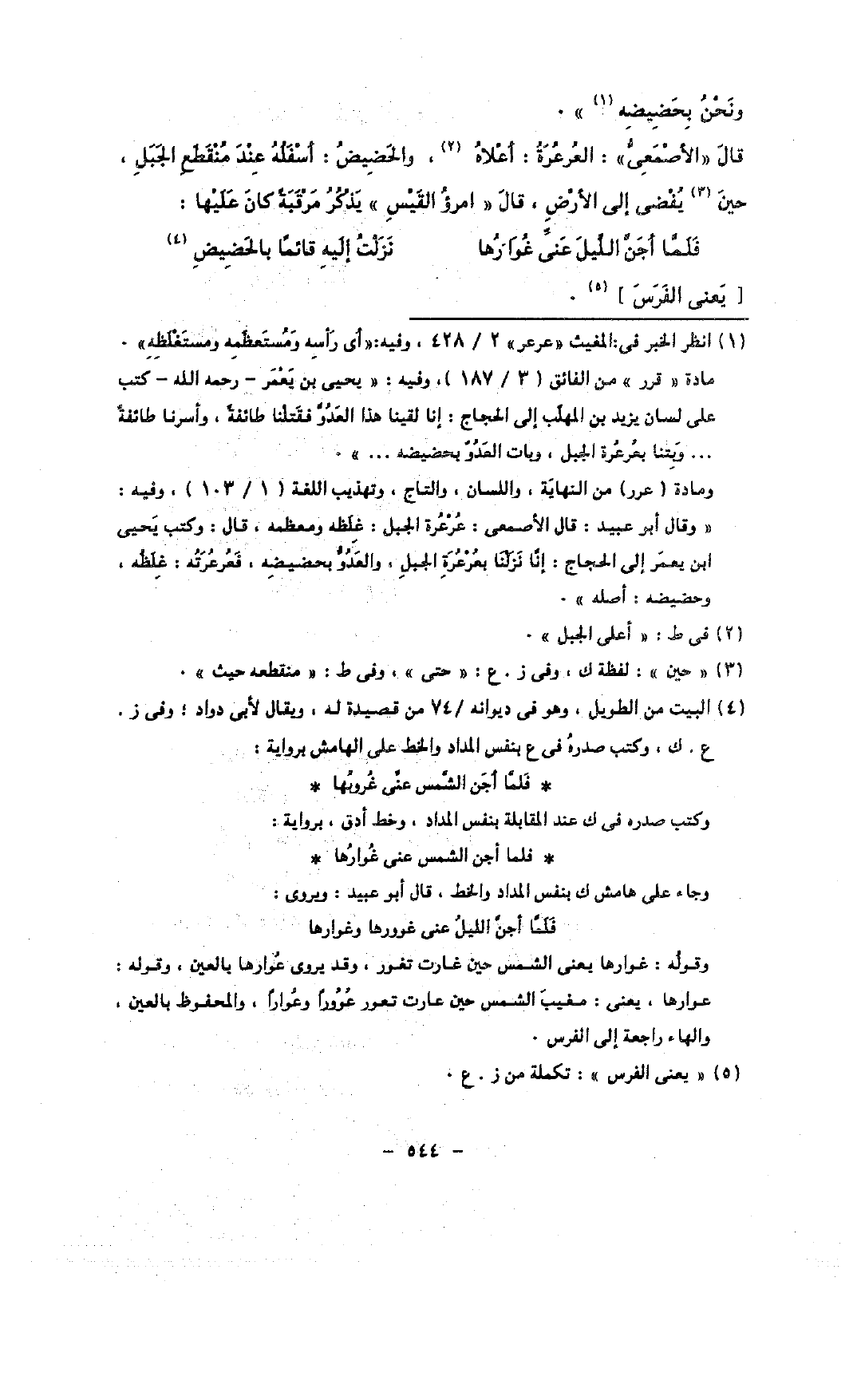 قال «الأصمعى»: العرعرة: أعلاه, والحضيض: أسفله عند منقطع الجبل, حين يفضى إلى الأرض, قال «امرؤ القيس» يذكر مرقبة كان عليها: