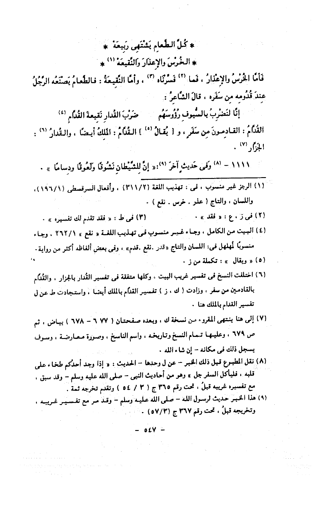 فأما الخرس والإعذار, فما فسرناه, وأما النقيعة: فالطعام يصنعه الرجل عند قدومه من سفره, قال الشاعر: