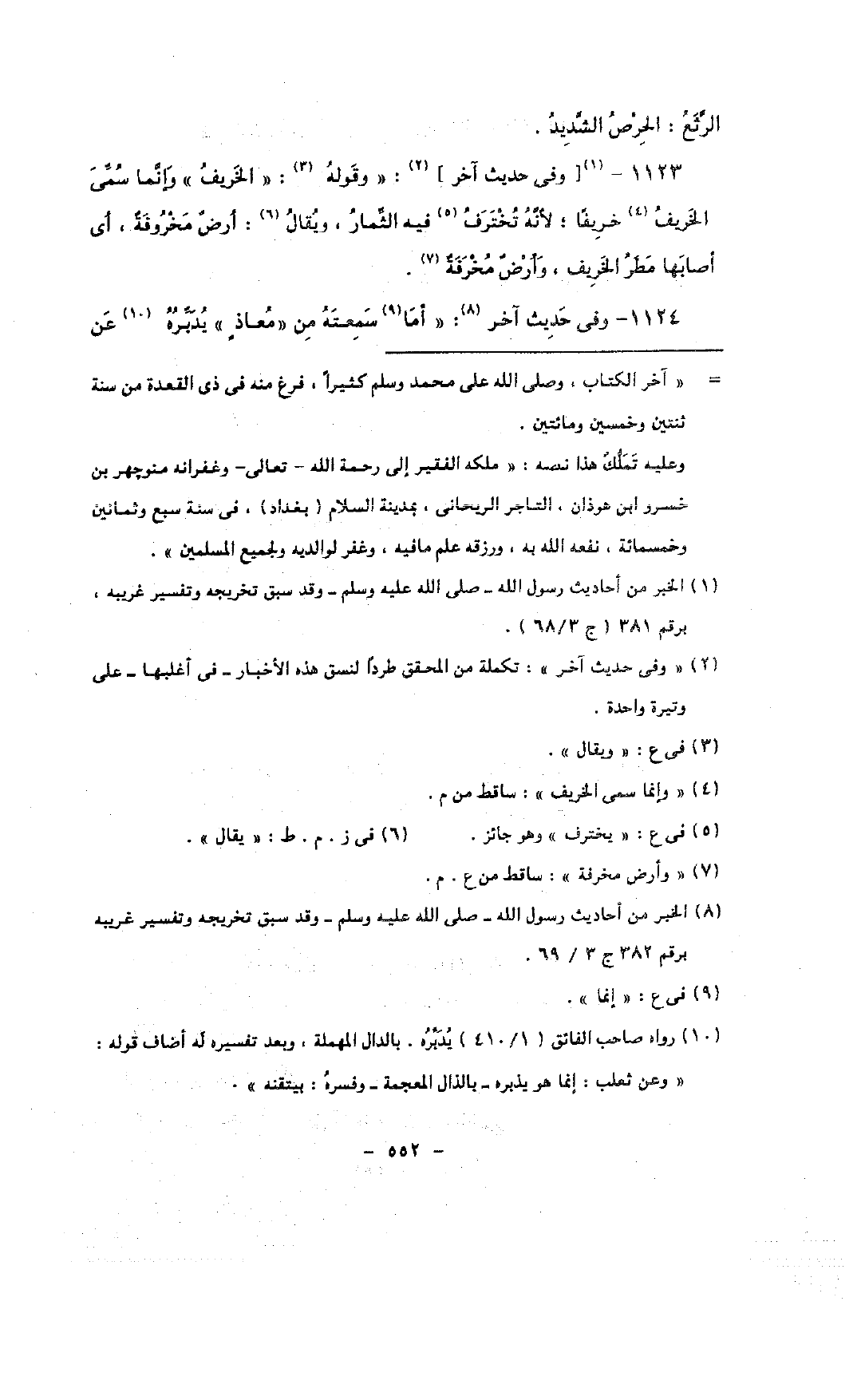 1123 - [وفى حديث آخر]: «وقوله: «الخريف» وإنما سمى الخريف خريفًا, لأنه تخترف فيه الثمار, ويقال: أرض مخروفة, أى أصابها مطر الخريف, وأرض مخرفة.