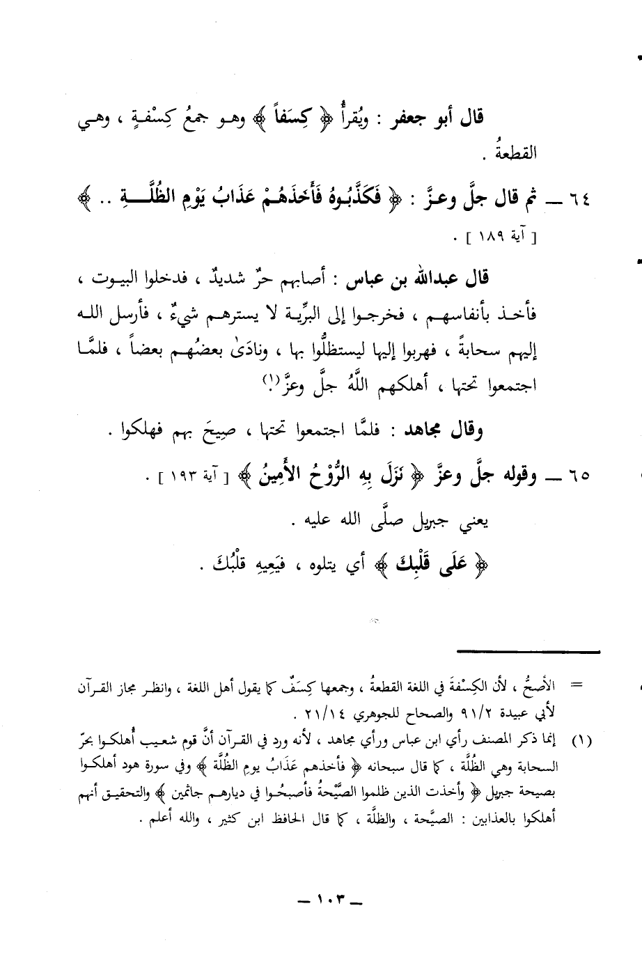 قال أبو جعفر ويقرأ كسفا وهو جمع كسفة وهي القطعة 64 - ثم قال جل وعز فكذبوه فأخذهم عذاب يوم الظلة آية 189 قال عبد الله بن عباس أصابهم حر شديد فدخلوا البيوت فأخذ بأنفاسهم فخرجوا إلى البرية لا يسترهم شئ فأرسل الله إليهم سحابة فهربوا إليها ليستظلوا بها ونادى بعضهم بعضا فلما اجتمعوا تحتها أهلكهم الله جل وعز وقال مجاهد فلما اجتمعوا تحتها صيح بهم فهلكوا 65 - وقوله جل وعز نزل به الروح الأمين آية 193 يعني جبريل صلى الله عليه على قلبك أي يتلوه فيعيه قلبك