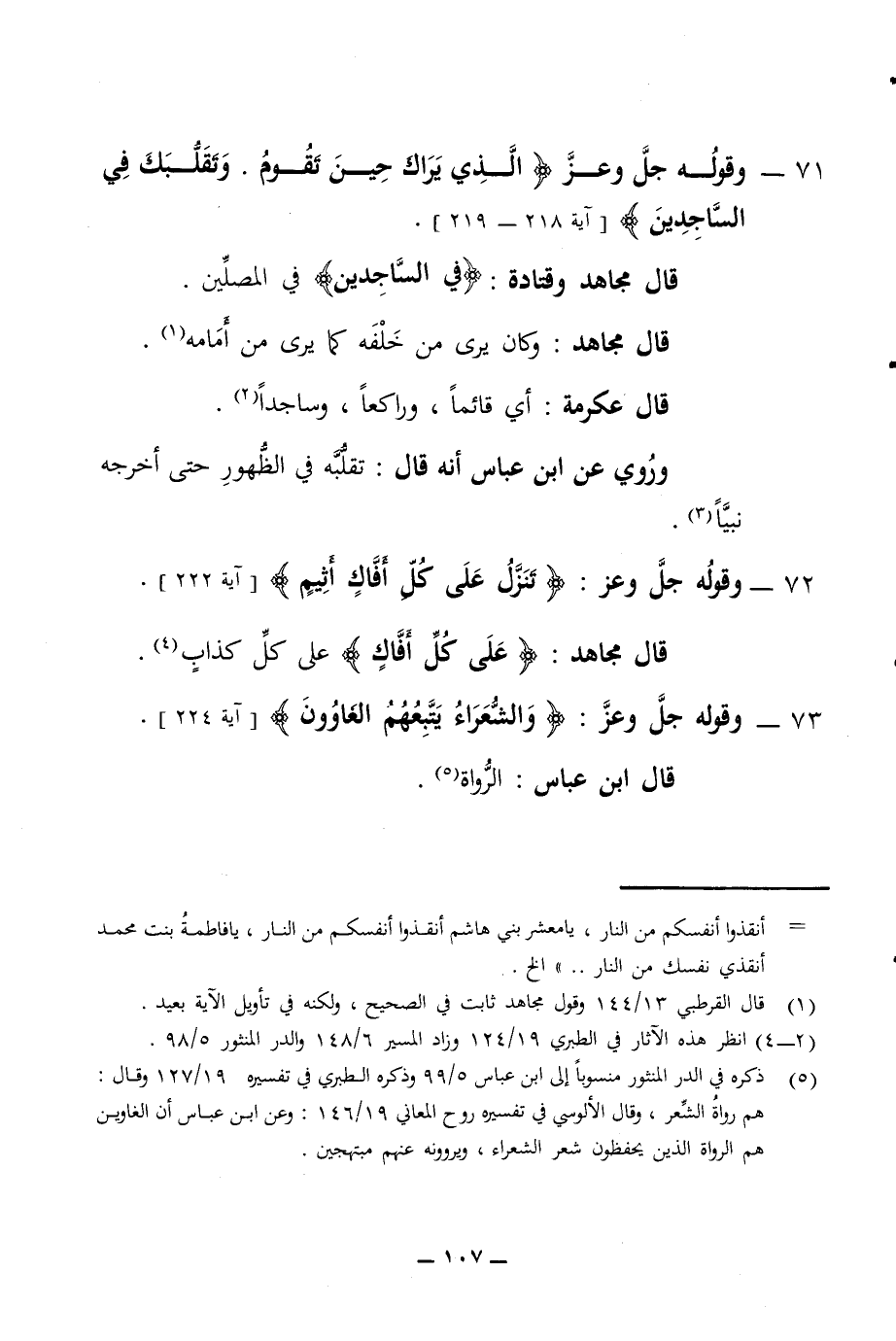 71 - وقوله جل وعز الذي يراك حين تقوم وتقلبك في الساجدين آية 219 218 قال مجاهد وقتادة في الساجدين في المصلين قال مجاهد وكان يرى من خلفه كما يرى من أمامه قال عكرمة أي قائما وراكعا وساجدا وروي عن ابن عباس أنه قال تقلبه في الظهور حتى أخرجه نبيا 72 - وقوله جل وعز تنزل على كل أفاك أثيم آية 222 قال مجاهد على كل أفاك على كل كذاب 73 - وقوله جل وعز والشعراء يتبعهم الغاوون آية 224 قال ابن عباس الرواة