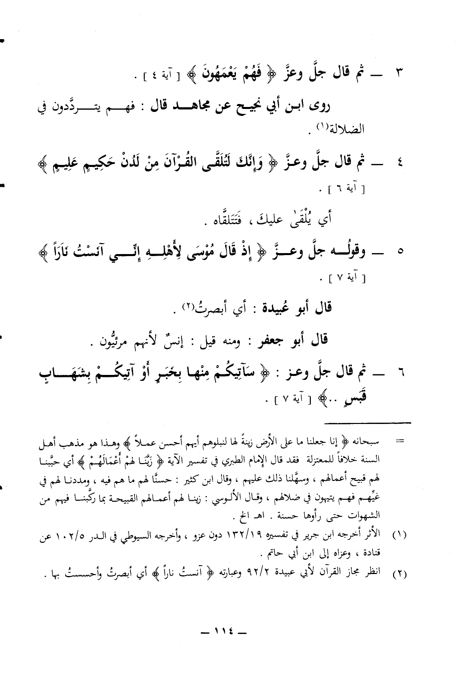 الضلالة 4 - ثم قال جل وعز وإنك لتلقى القرآن من لدن حكيم عليم آية 6 أي يلقى عليك فتتلقاه 5 - وقوله جل وعز إذ قال موسى لأهله إني آنست نارا آية 7 قال أبو عبيدة أي أبصرت قال أبو جعفر ومنه قيل إنس لأنهم مرئيون 6 - ثم قال جل وعز سأتيكم منها بخبر أو آتيكم بشهاب قبس آية 7