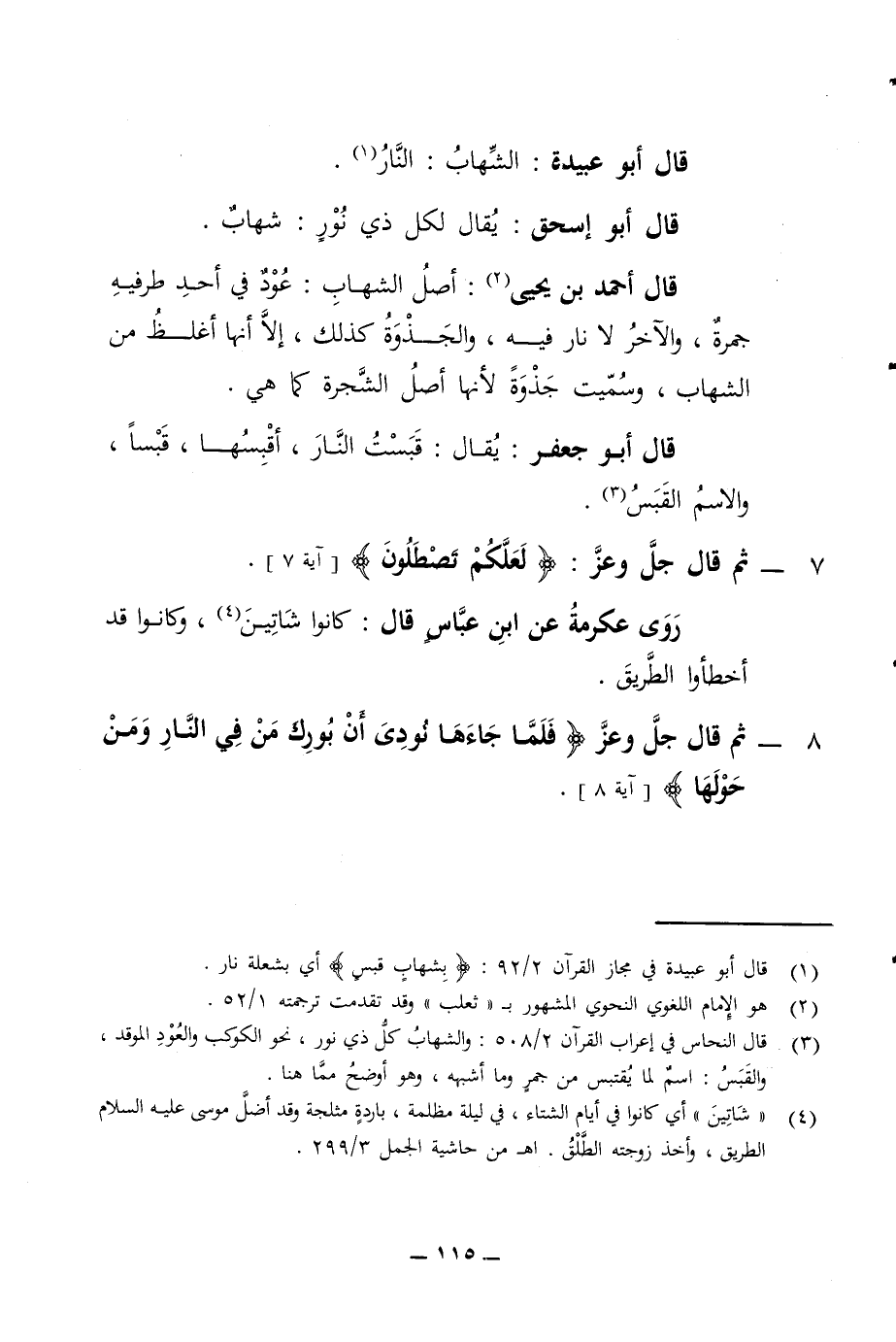 قال أبو عبيدة الشهاب النار قال أبو إسحق يقال لكل ذي نور شهاب قال أحمد بن يحيى أصل الشهاب عود في أحد طرفيه جمرة والآخر لا نار فيه والجذوة كذلك إلا أنها أغلظ من الشهاب وسميت جذوة لأنها أصل الشجرة كما هي قال أبو جعفر يقال قبست النار أقبسها قال قبسا والاسم القبس 7 - ثم قال جل وعز لعلكم تصطلون آية 7 روى عكرمة عن ابن عباس قال كانوا شاتين وكانوا قد أخطأوا الطريق 8 - ثم قال جل وعز فلما جاءها نودي أن بورك من في النار ومن