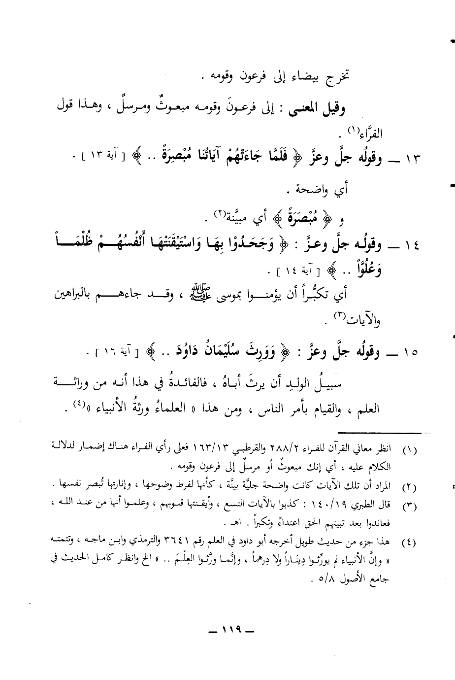 تخرج بيضاء إلى فرعون وقومه وقيل المعنى إلى فرعون وقومه مبعوث ومرسل وهذا قول الفراء 13 - وقوله جل وعز فلما جاءتهم آياتنا مبصرة آية 13 أي واضحة ومبصرة أي مبينة 14 - وقوله جل وعز وجحدوا بها واستيقنتها أنفسهم ظلما وعلوا آية 14 أي تكبرا أن ؤمنوا عن بموسى صلى الله عليه وسلم وقد جاءهم بالبراهين والآيات 15 - وقوله جل وعز وورث سليمان داود آية 16 سبيل الولد أن يرث أباه فالفائدة في هذا أنه من وراثة العلم والقيام بأمر الناس ومن هذا العلماء ورثة الأنبياء
