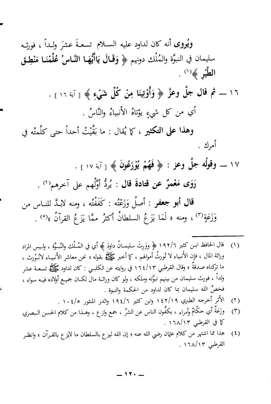 ويروى أنه كان لداود عليه السلام تسعة عشر ولدا فورثه سليمان في النبوة والملك دونهم وقال يا أيها الناس علمنا منطق الطير 16 - ثم قال جل وعز وأوتينا من كل شئ آية 16 أي من كل شئ يؤتاه الأنبياء والناس وهذا على التكثير كما يقال ما بقيت أحدا حتى كلمته في