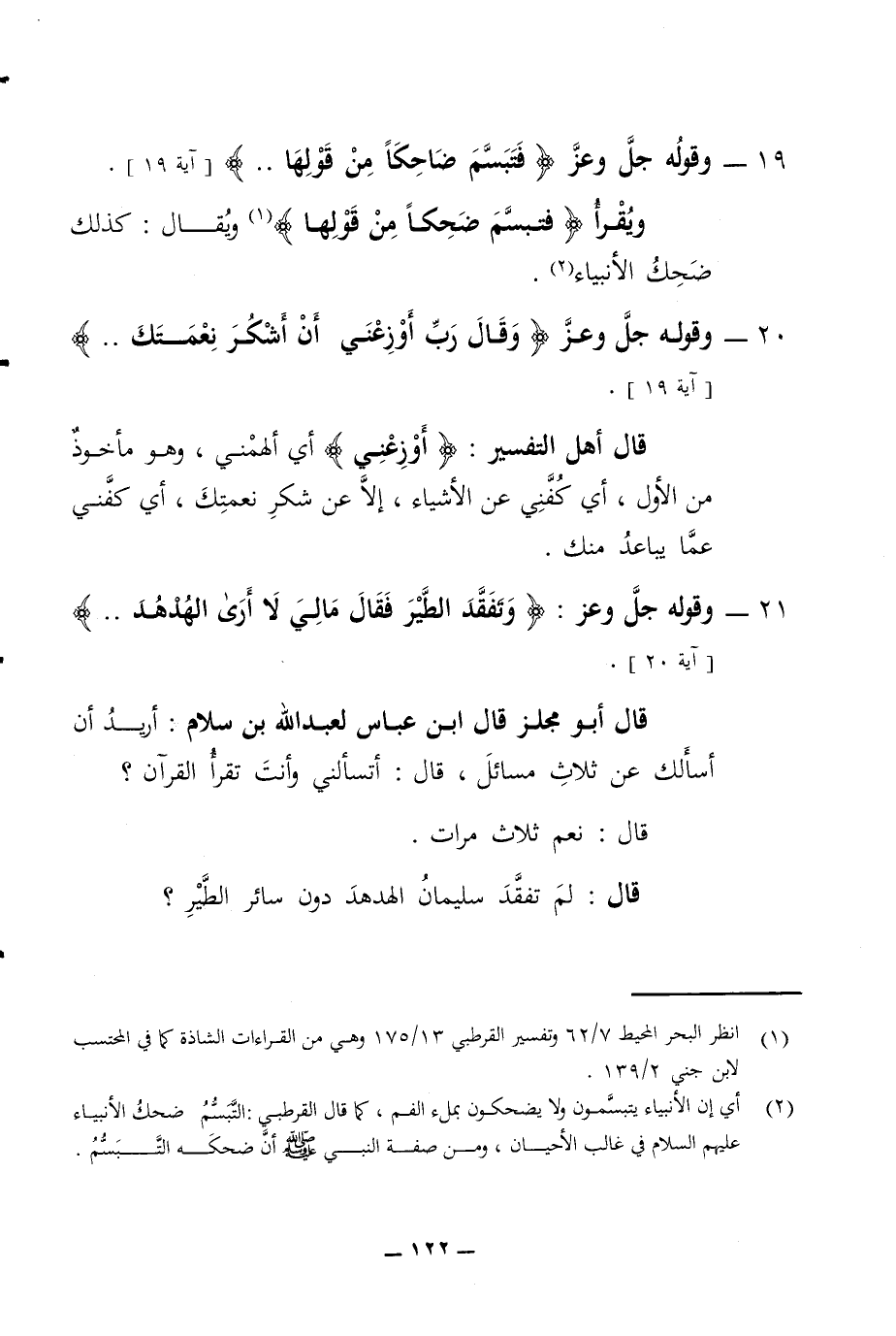 آية 19 قال أهل التفسير أوزعني أألهمني وهو مأخوذ من الأول أي كفني عن الأشياء إلا عن شكر نعمتك أي كفني عما يباعد منك 21 - وقوله جل وعز وتفقد الطير فقال مالي لا أرى الهدهد آية 20 قال أبو مجلز قال ابن عباس لعبد الله بن سلام أريد أن أسألك عن ثلاث مسائل قال أتسألني وأنت تقرأ القرآن قال نعم ثلاث مرات قال لم تفقد سليمان الهدهد دون سائر الطير