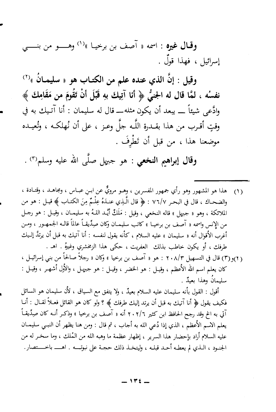 وقال غيره اسمه آصف بن برخيا وهو من بني إسرائيل فهذا قول وقيل إن الذي عنده علم من الكتاب هو سليمان نفسه لما قال له الجني أنا آتيك به قبل أن تقوم من مقامك وادعى شيئا يبعد أن يكون مثله قال له سليمان أنا آتيك به في وقت أقرب من هذا بقدرة الله جل وعز على أن نهلكه وتعيده موضعنا هذا من قبل أن تطرف وقال إبراهيم النخعي هو جبريل صلى الله عليه وسلم