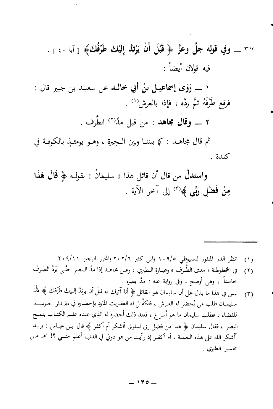 37 - وفي قوله جل وعز قبل أن يرتد إليك طرفك آية 40 فيه قولان أيضا روى إسماعيل بن أبي خالد عن سعيد بن جبير قال فرفع طرفه ثم رده فإذا بالعرش وقال مجاهد من قبل مد الطرف ثم قال مجاهد كما بيننا وبين الحيرة وهو يومئذ بالكوفة في كندة واستدل من قال إن قائل هذا سليمان بقوله قال هذا من فضل ربي إلى آخر الآية