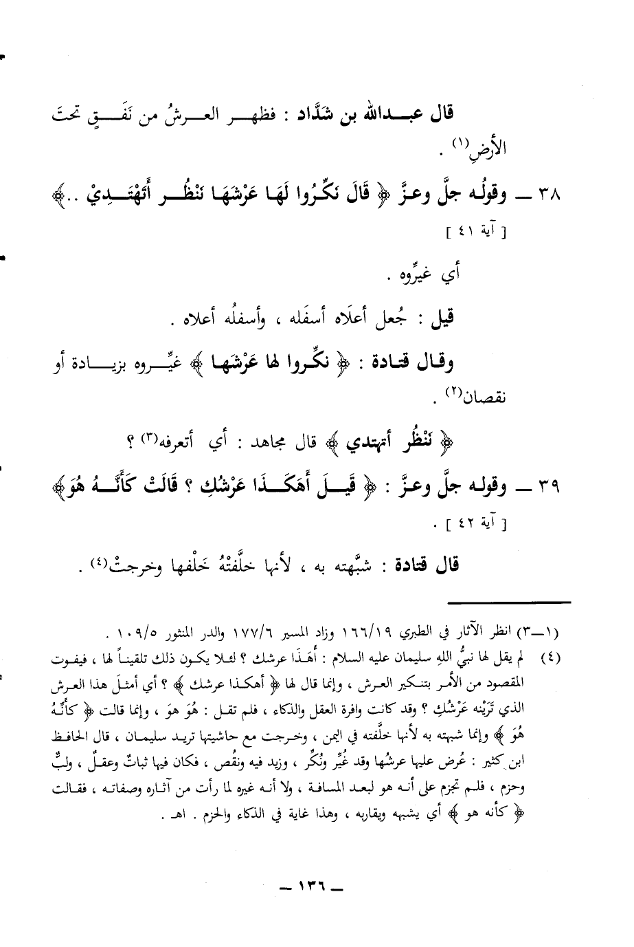 الأرض 38 - وقوله جل وعز قال نكروا لها عرشها تنظر أتهتدي آية 41 أي غيروه قيل جعل أعلاه أسفله وأسفله أعلاه وقال قتادة نكروا لها عرشها غيروه بزيادة أو نقصان ننظر أتهتدي قال مجاهد أي أتعرفه 39 - وقوله جل وعز قيل أهكذا عرشك قالت كأنه هو آية 42 قال قتادة شبهته به لأنها خلفته خلفها وخرجت