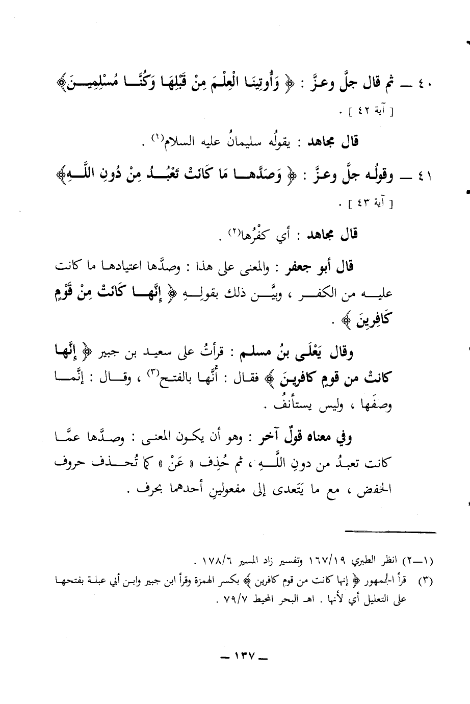 40 - ثم قال جل وعز وأوتينا العلم من قبلها وكنا مسلمين آية 42 قال مجاهد يقوله سليمان عليه السلام 41 - وقوله جل وعز وصدها ما كانت تعبد من دون الله آية 43 قال مجاهد أي كفرها قال أبو جعفر والمعنى على هذا وصدها اعتيادها ما كانت عليه من الكفر وبين ذلك بقوله إنها كانت من قوم كافرين وقال يعلى بن مسلم قرأت على سعيد بن جبير إنها