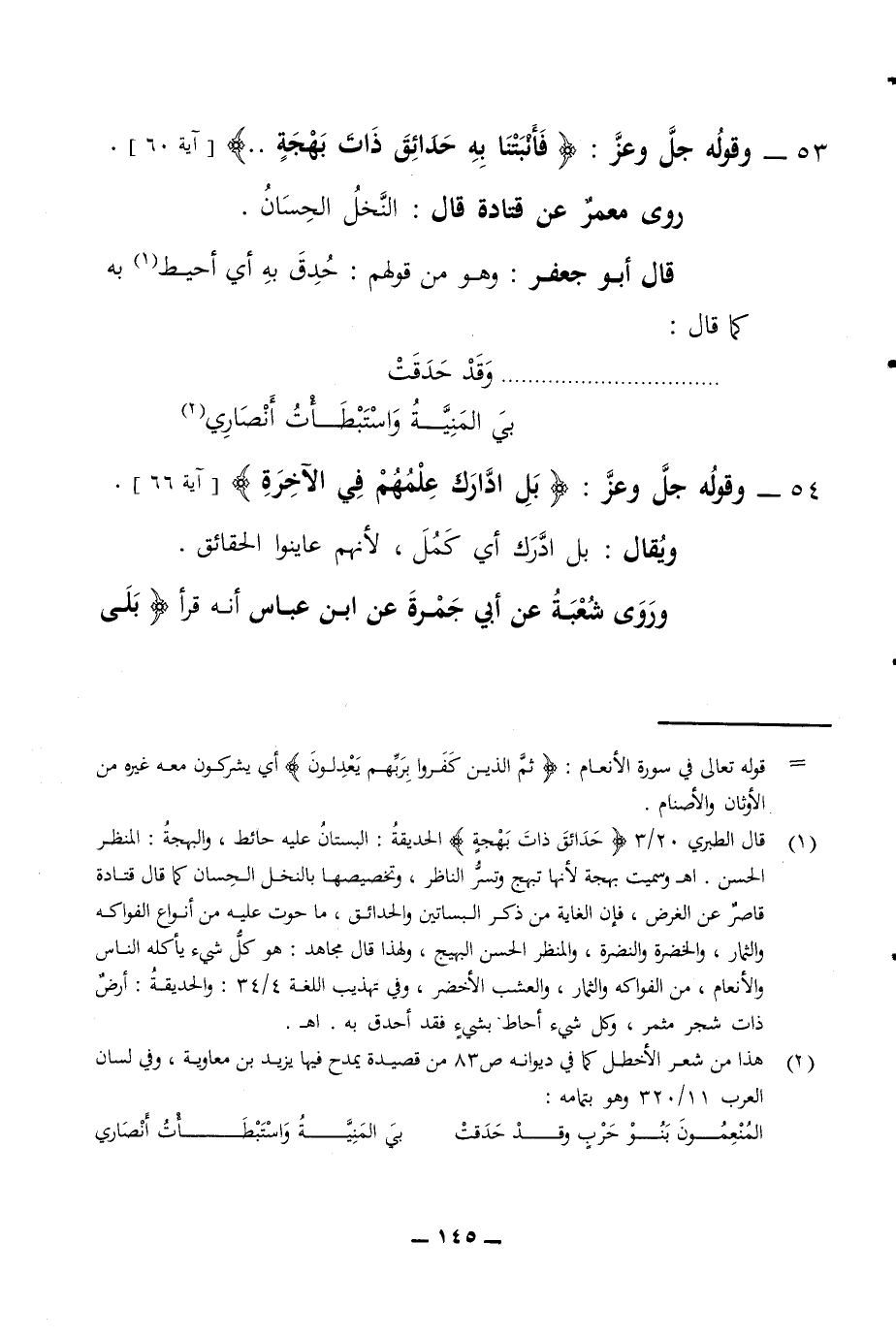 53 - وقوله جل وعز فأنبتنا به حدائق ذات بهجة آية 60 روى معمر عن قتادة قال النخل الحسان قال أبو جعفر وهو من قولهم حدق به أي أحيط به كما قال وقد حدقت بي المنية واستبطأت أنصاري 54 - وقوله جل وعز بل ادارك علمهم في الآخرة آية 66 ويقال بل ادرك أي كمل لأنهم عاينوا الحقائق وروى شعبة عن أبي حمزة عن ابن عباس أنه قرأ بلى
