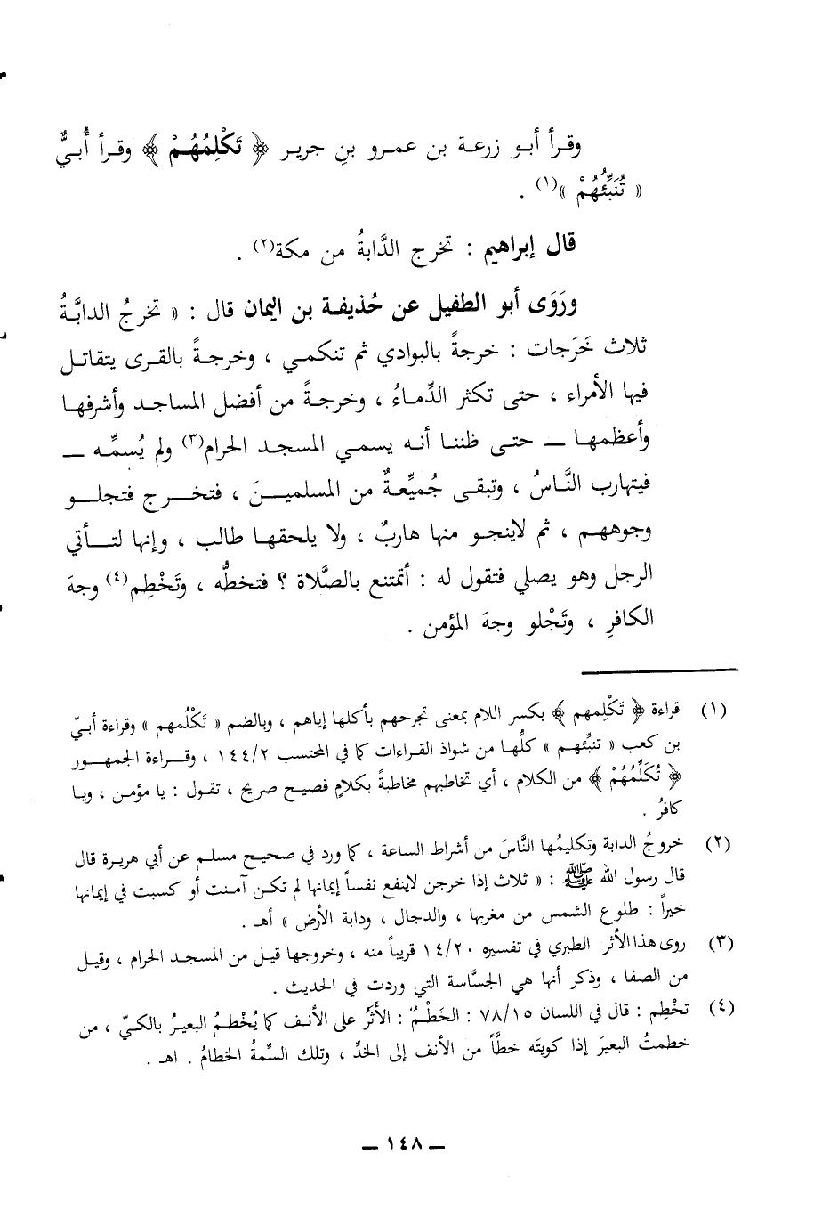 تنبئهم قال إبراهيم تخرج الدابة من مكة وروى أبو الطفيل عن حذيفة بن اليمان قال تخرج الدابة ثلاث خرجات خرجة بالبوادي ثم تنكمي وخرجة بالقرى يتقاتل فيها الأمراء حتى تكثر الدماء وخرجة من أفضل المساجد وأشرفها وأعظمها حتى ظننا أنه يسمى المسجد الحرام ولم يسمه فيتهارب وكان الناس وتبقى جميعة من المسلمين فتخرج فتجلو وجوههم ثم لا ينجو منها هارب ولا يلحقها طالب وإنها لتأتي الرجل وهو يصلي فتقول له أتمتنع روى بالصلاة فتخطه ولم وتخطم وجه الكافر وتجلو وجه المؤمن