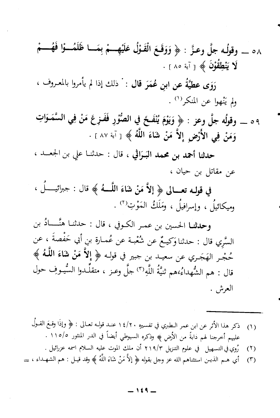 59 - وقوله جل وعز ووقع القول عليهم بما ظلموا فهم لا ينطقون آية 85 روى عطية عن ابن عمر قال ذلك إذا لم يأمروا بالمعروف ولم ينهوا عن المنكر وقوله جل وعز ويوم ينفخ في الصور ففزع من في السموات ومن في الأرض إلا من شاء الله آية 87 حدثنا أحمد بم محمد البراثي قال حدثنا علي بن الجعد عن مقاتل بن حيان في قوله تعالى إلا من شاء الله قال جبرائيل وميكائيل وإسرافيل وملك الموت وحدثنا الحسين بن عمر الكوفي قال حدثنا هناد بن