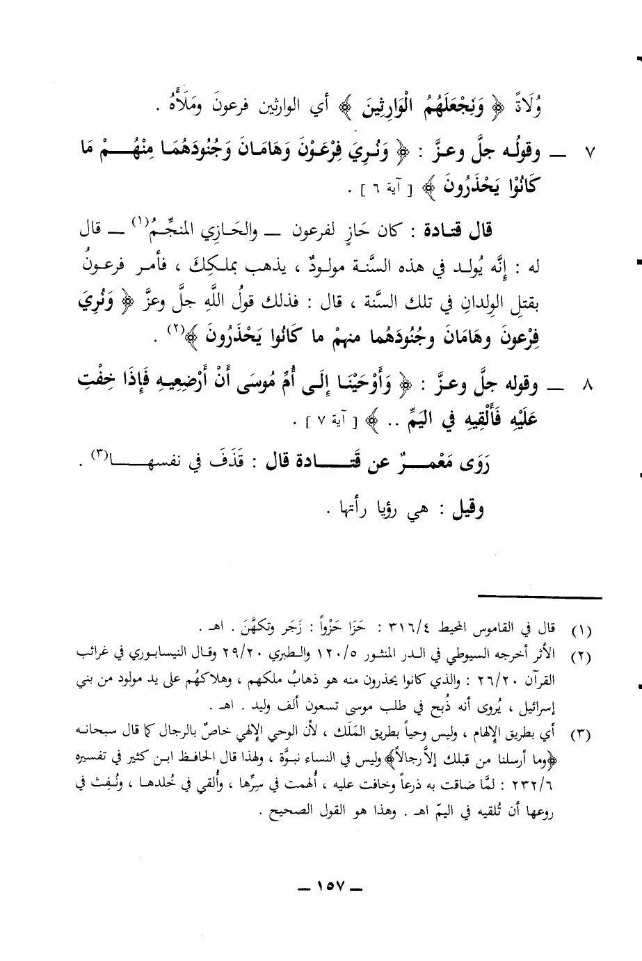 ولاة ونجعلهم الوارثين أي الوارثين فرعون وملأه 7 - وقوله جل وعز ونري فرعون وهامان وجنودهما منهم ما كانوا يحذرون آية 6 قال قتادة كان حاز لفرعون والحازي المنجم قال له إنه يولد في هذه السنة مولود يذهب بملكك فأمر فرعون بقتل الولدان في تلك السنة قال فذلك قول الله جل وعز ونري فرعون وهامان وجنودهما منهم ما كانوا يحذرون 8 - وقوله جل وعز وأوحينا إلى أم موسى أن أرضعيه فإذا خفت عليه فألقيه في اليم آية 7 روى معمر عن قتادة قال قذف في نفسها وقيل هي رؤيا رأتها