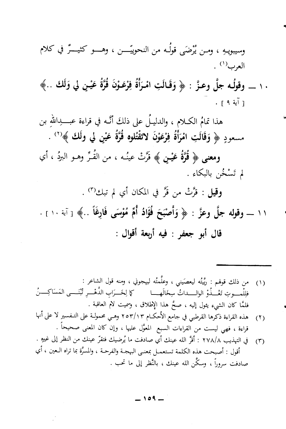 وسيبويه ومن يرضى قوله من النحويين وهو كثير في كلام العرب 10 - وقوله جل وعز وقالت امرأة فرعون قرة عين لي ولك آية 9 هذا تمام الكلام والدليل على ذلك أنه في قراءة عبد الله بن مسعود وقالت امرأة فرعون لا تقتلوه قرة عين لي ولك ومعنى قرة عين قرت عينه من القر وهو البرد أي لم تسخن بالبكاء وقيل قرت من قر في المكان أي لم تبك