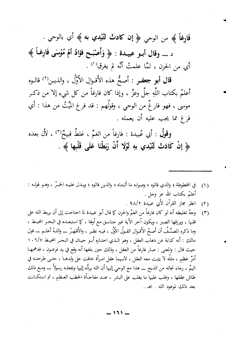 وقول أبي عبيدة فارغا من الغم غلط قبيح لأن بعده إن كادت لتبدي به لولا أن ربطنا على قلبها