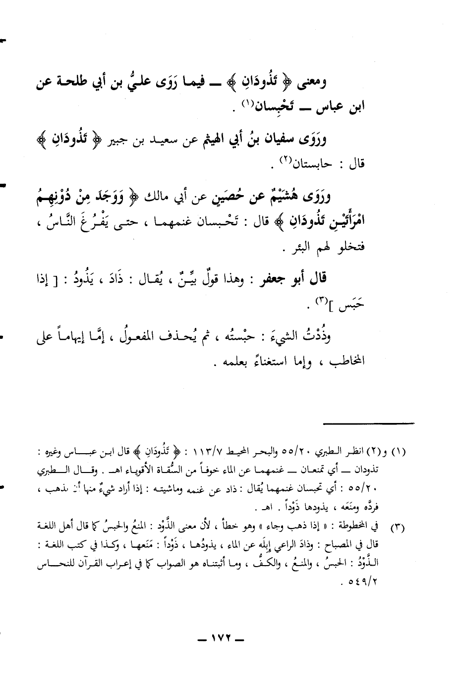 امرأتين تذودان قال تحبسان غنمهما حتى يفرغ الناس فتخلو لهم البئر قال أبو جعفر وهذا قول بين يقال ذاد يذود إذا حبس وذدت يا الشئ حبسته ثم يحذف المفعول إما إيهاما على المخاطب وإما استغناء بعلمه