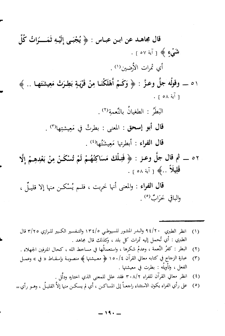 قال مجاهد عن ابن عباس يجبى إليه ثمرات كل شئ آية 57 أي ثمرات الأرضين 51 - وقوله جل وعز وكم أهلكنا من قرية بطرت معيشتها آية 58 البطر الطغيان بالنعمة قال أبو إسحق المعنى بطرت في معيشتها قال الفراء أبطرتها معيشتها 52 - ثم قال جل وعز فتلك مساكنهم لم تسكن من بعدهم إلا قليلا