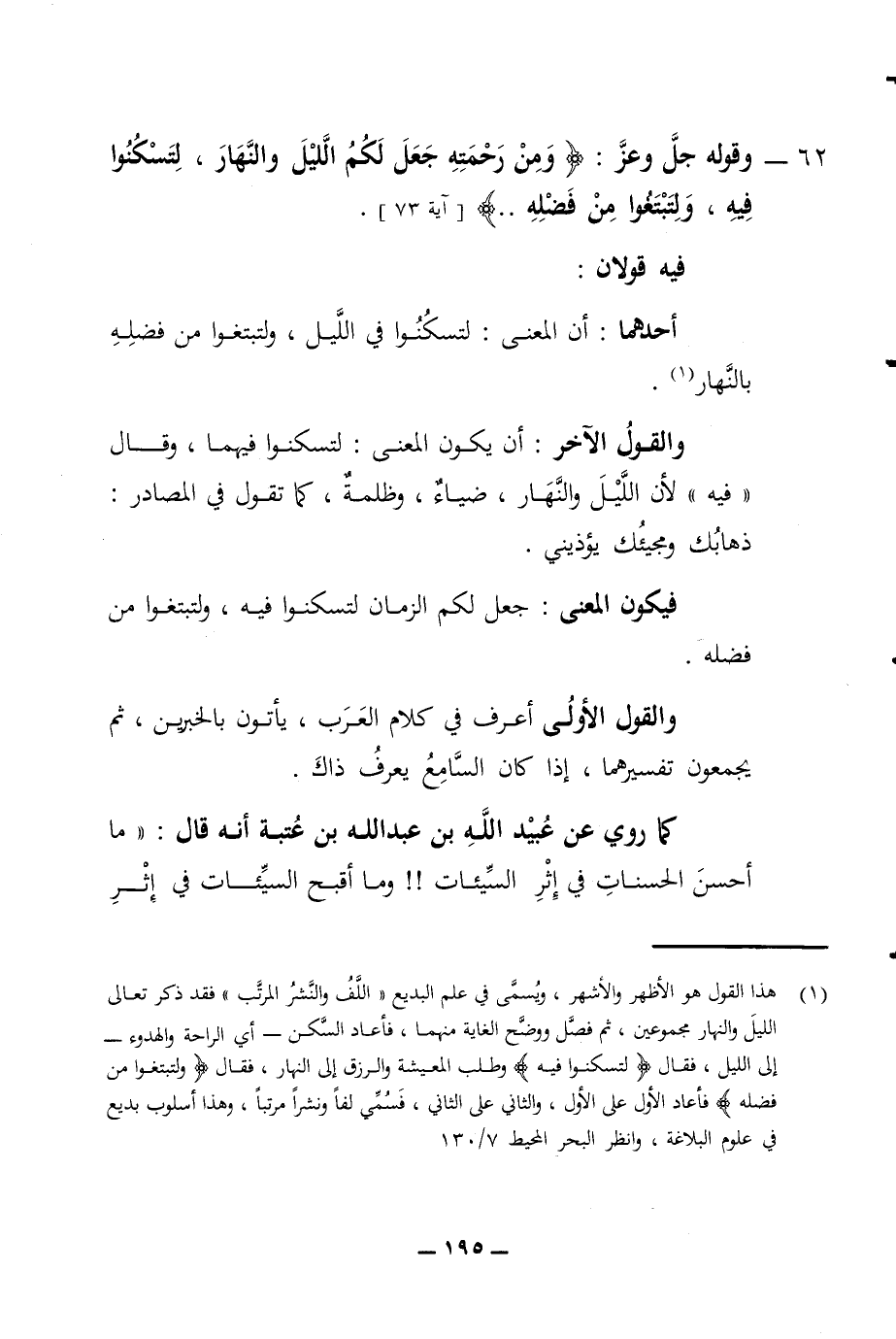 62 - وقوله جل وعز ومن رحمته جعل لكم الليل والنهار لتسكنوا فيه ولتبتغوا من فضله آية 73 فيه قولان أحدهما أن المعنى لتسكنوا في الليل ولتبتغوا من فضله بالنهار والقول الآخر أن يكون المعنى لتسكنوا فيهما وقال فيه لأن الليل والنهار ضياء وظلمة كما تقول في المصادر ذهابك ومجيئك يؤذيني فيكون المعنى جعل لكم الزمان لتسكنوا فيه ولتبتغوا من فضله والقول الأولى أعرف في كلام العرب يأتون بالخبرين ثم يجمعون تفسيرهما إذا كان السامع يعرف ذاك كما روى عن عبيد الله بن عبد الله بن عتبة أنه قال ما أحسن الحسنات في إثر السيئات وما أقبح السيئات في إثر