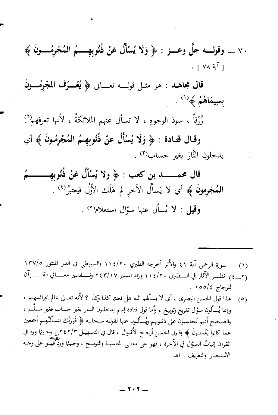 202 - وقوله جل وعز ولا يسأل عن ذنوبهم المجرمون آية 78 قال مجاهد هو مثل قوله تعالى يعرف المجرمون بسيماهم زرقا سود الوجوه لا تسأل عنهم الملائكة لأنها تعرفهم وقال قتادة ولا يسأل عن ذنوبهم المجرمون أي يدخلون النار بغير حساب قال محمد بن كعب ولا يسأل عن ذنوبهم المجرمون أي لا يسأل الآخر لم هلك الأول فيعتبر وقيل لا يسأل عنها سؤال استعلام