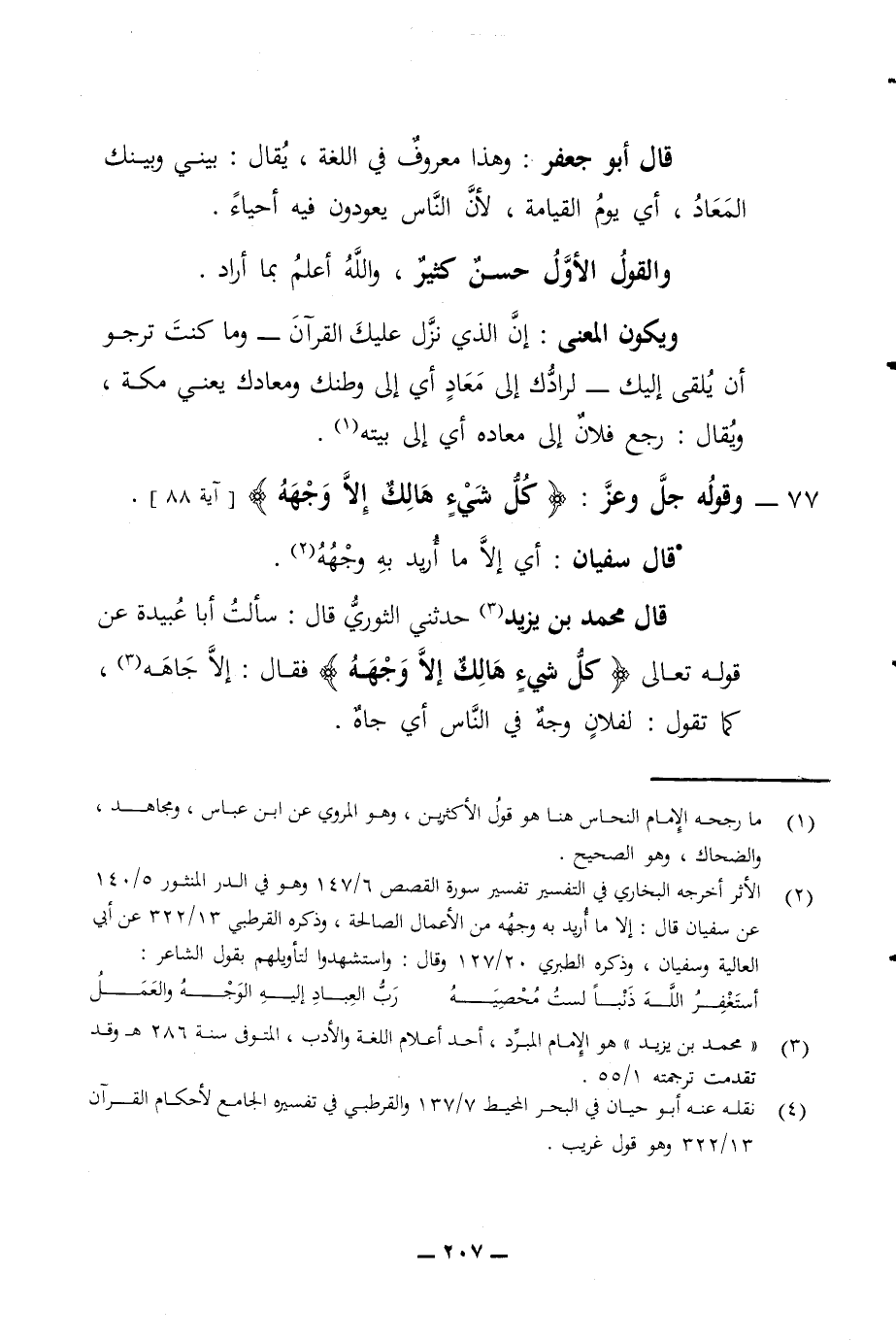 المعاد أي يوم القيامة لأن الناس يعودون فيه أحياء والقول الأول حسن كثير والله أعلم بما أراد ويكون المعنى إن الذي نزل عليك القرآن وما كنت ترجو أن يلقى إليك لرادك إلى معاد أي إلى وطنك ومعادك يعني مكة ويقال رجع فلان إلى معاده أي الى بيته 77 - وقوله جل وعز كل شئ هالك إلا وجهه آية 88 قال سفيان أي إلا ما أريد به وجهه قال محمد بن يزيد حدثني الثوري قال سألت أبا عبيدة عن قوله تعالى كل شئ هالك إلا وجهه فقال إلا جاهه كما تقول لفلان وجه في الناس أي جاه