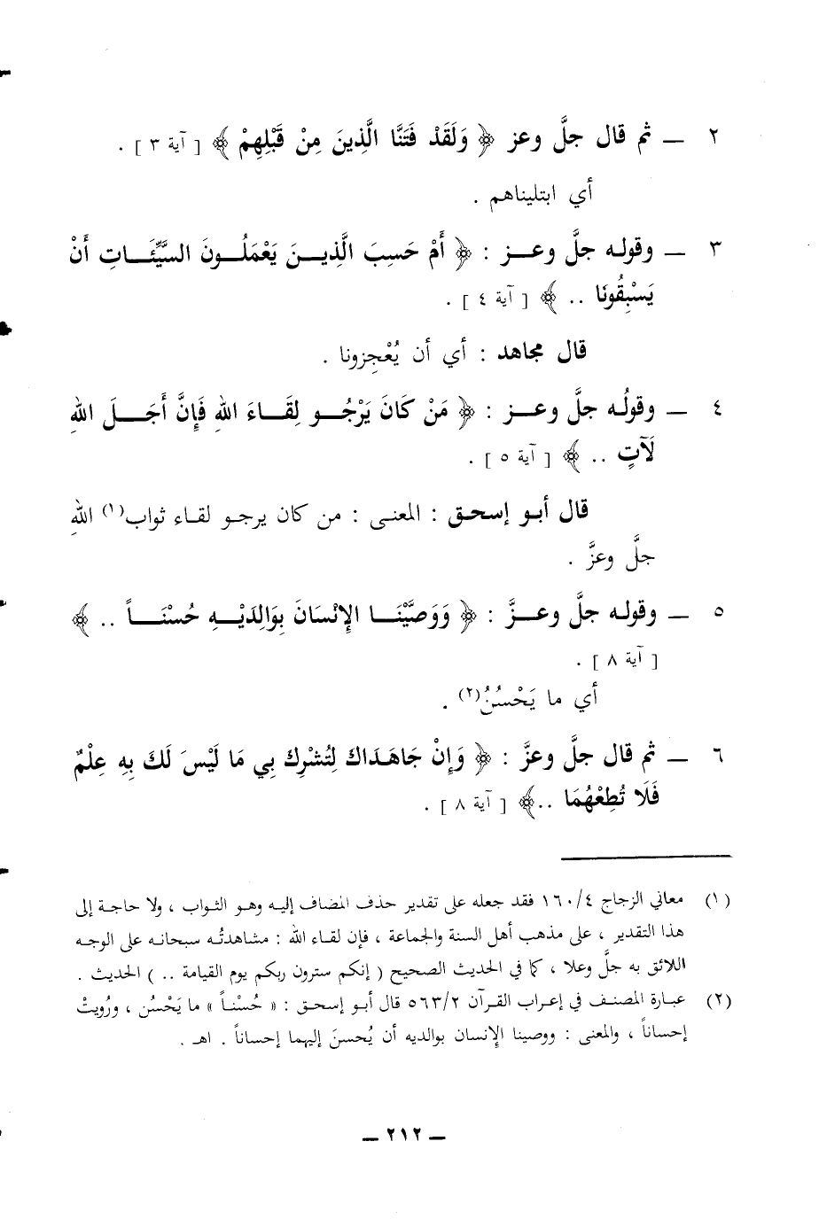 2 - ثم قال جل وعز ولقد فتنا الذين من قبلهم آية 3 أي ابتليناهم 3 - وقوله جل وعز أم حسب الذين يعملون السيئات أن يسبقونا آية 4 قال مجاهد أي أن يعجزونا 4 - وقوله جل وعز من كان يرجو لقاء الله فإن أجل الله لآت آية 5 قال أبو إسحق المعنى من كان يرجو لقاء ثواب الله جل وعز 5 - وقوله جل وعز ووصينا الإنسان بوالديه حسنا آية 8 أي ما يحسن 6 - ثم قال جل وعز وإن جاهداك لتشرك بي ما ليس لك به علم