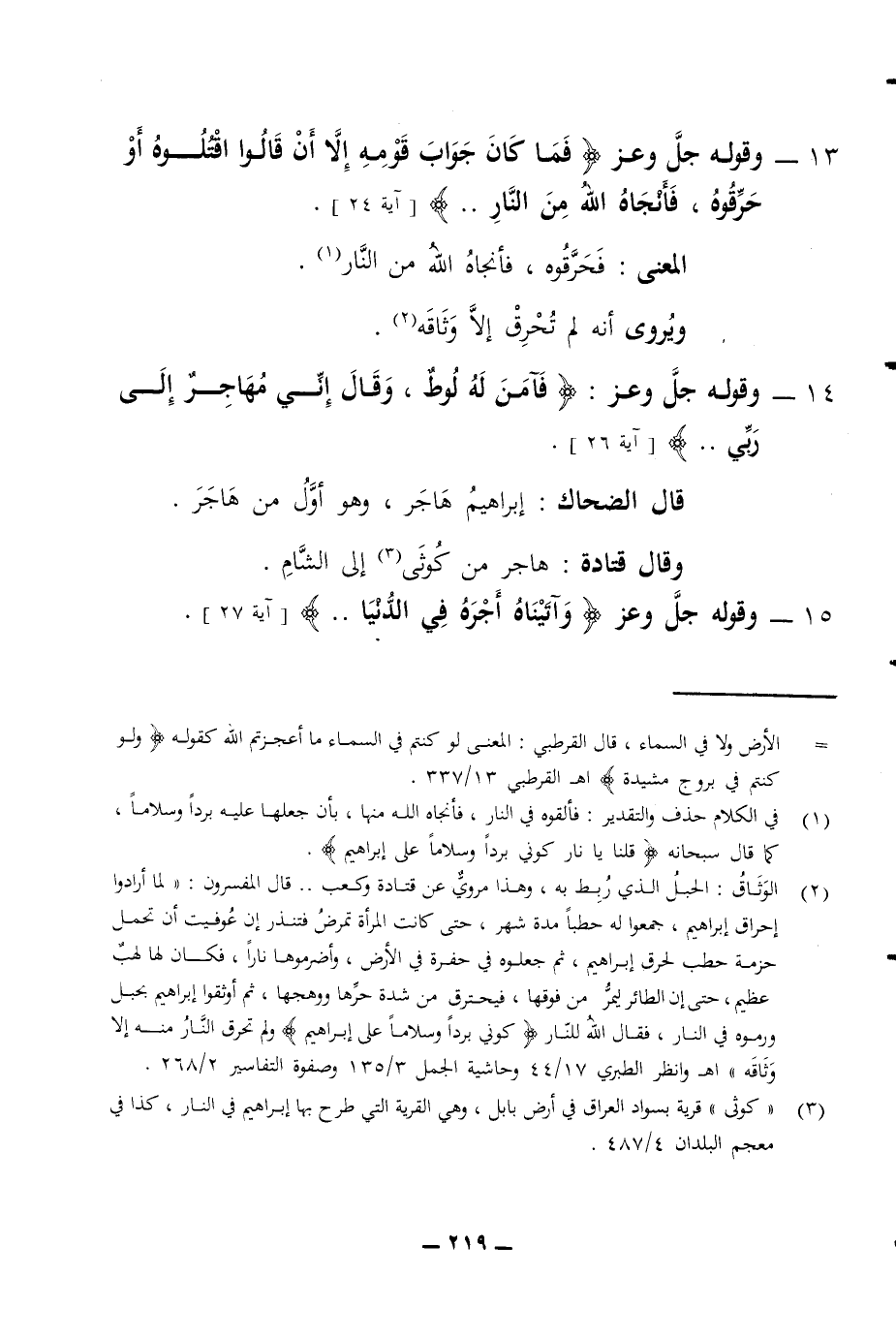 13 - وقوله جل وعز فما كان جواب قومه إلا أن قالوا اقتلوه أو حرقوه فأنجاه الله من النار آية 24 المعنى فحرقوه فأنجاه الله من النار ويروى أنه لم تحرق إلا وثاقه 14 - وقوله جل وعز فآمن له لوط وقال إني مهاجر إلى ربي آية 26