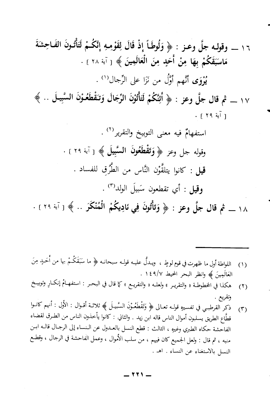 16 - وقوله جل وعز ولوطا إذ قال لقومه إنكم لتأتون الفاحشة ما سبقكم بها من أحد من العالمين آية 28 يروى أنهم أول من نزا على الرجال 17 - ثم قال جل وعز أئنكم لتأتون الرجال وتقطعون السبيل آية 29 استفهام فيه معنى التوبيخ والتقرير