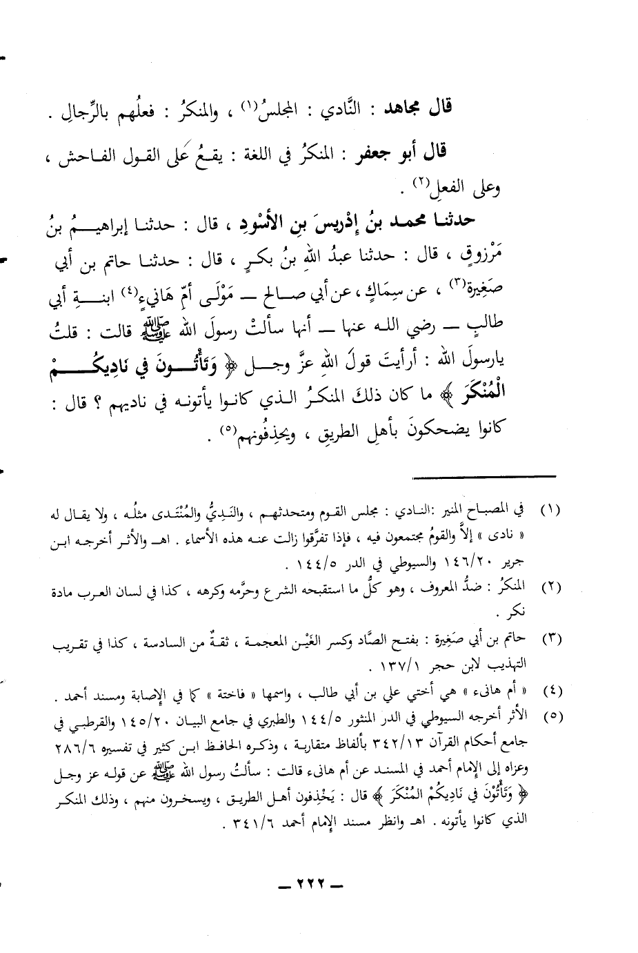 قال مجاهد النادي المجلس والمنكر فعلهم بالرجال قال أبو جعفر المنكر في اللغة يقع على القول الفاحش وعلى الفعل حدثنا محمد بن إدريس بن الأسود قال حدثنا إبراهيم بن مرزوق قال حدثنا عبد الله بن بكر قال حدثنا حاتم بن أبي صغيرة عن سماك عن أبي صالح مولى أم هانئ ابنة أبي طالب رضي الله عنها أنها سألت رسول الله صلى الله عليه وسلم قالت قلت يا رسول الله أرأيت قول الله عز وجل وتأتون في ناديكم المنكر ما كان ذلك المنكر الذي كانوا يأتونه في ناديهم قال كانوا يضحكون بأهل الطريق ويحذفونهم