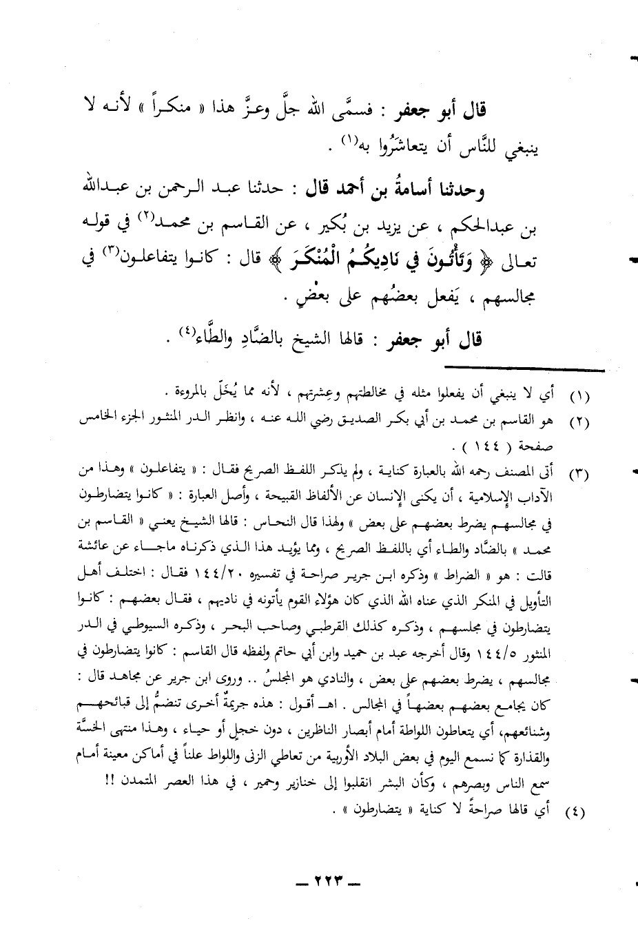 قال أبو جعفر فسمى الله جل وعز هذا منكرا لأنه لا ينبغي للناس أن يتعاشروا به وحدثنا أسامة بن أحمد قال حدثنا عبد الرحمن بن عبد الله بن عبد الحكم عن يزيد بن بكير عن القاسم بن محمد في قوله تعالى وتأتون في ناديكم المنكر قال كانوا يتفاعلون في مجالسهم يفعل بعضهم على بعض