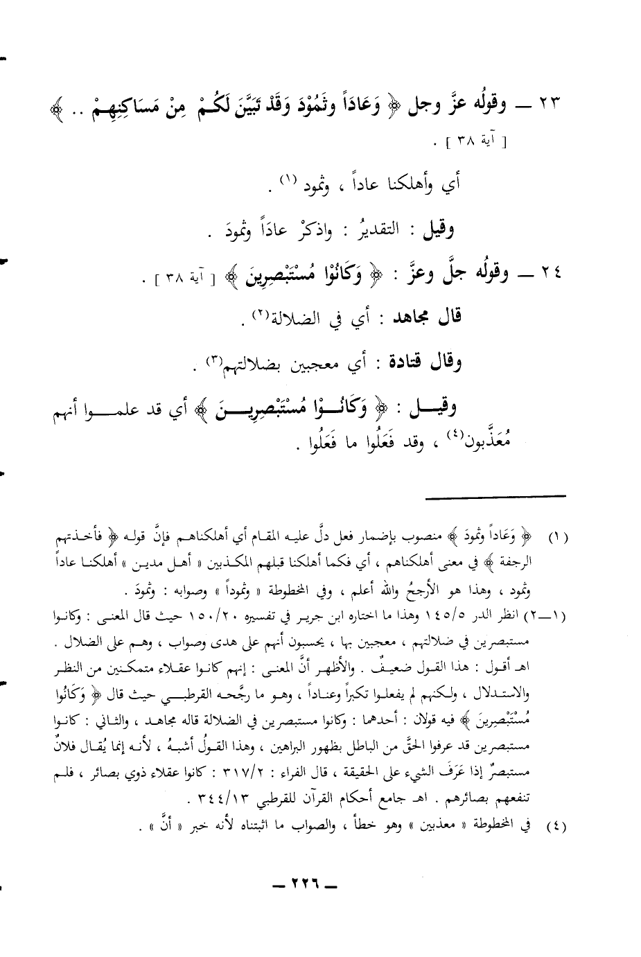 23 - وقوله عز وجل وعادا وثمود وقد تبين لكم من مساكنهم آية 38 أي وأهلكنا عادا وثمود وقيل التقدير واذكر عادا وثمود 24 - وقوله جل وعز وكانوا مستبصرين آية 38 قال مجاهد أي في الضلالة وقال قتادة أي معجبين بضلالتهم وقيل وكانوا مستبصرين أي قد علموا أنهم معذبون وقد فعلوا ما فعلوا