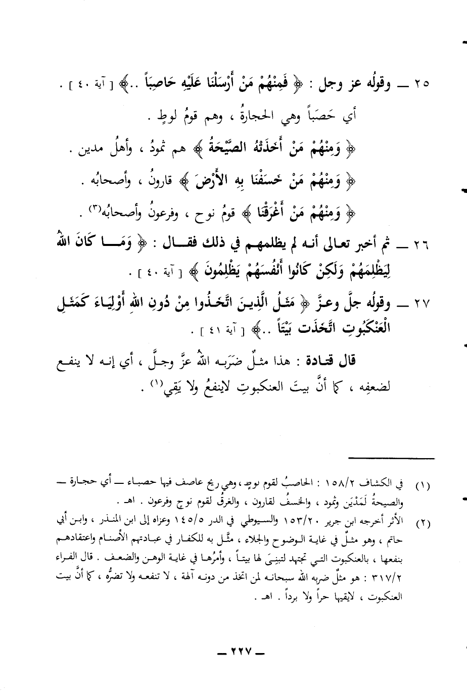 25 - وقوله عز وجل فمنهم من أرسلنا عليه حاصبا آية 40 أي حصبا وهي الحجارة وهم قوم لوط ومنهم من أخذته الصيحة هم ثمود وأهل مدين ومنهم من خسفنا به الأرض قارون وأصحابه ومنهم من أغرقنا قوم نوح وفرعون وأصحابه 26 - ثم أخبر تعالى أنه لم يظلمهم في ذلك فقال وما كان الله ليظلمهم ولكن كانوا أنفسهم يظلمون آية 40 27 - وقوله جل وعز مثل الذين اتخذوا من دون الله أولياء كمثل العنكبوت اتخذت بيتا آية 41