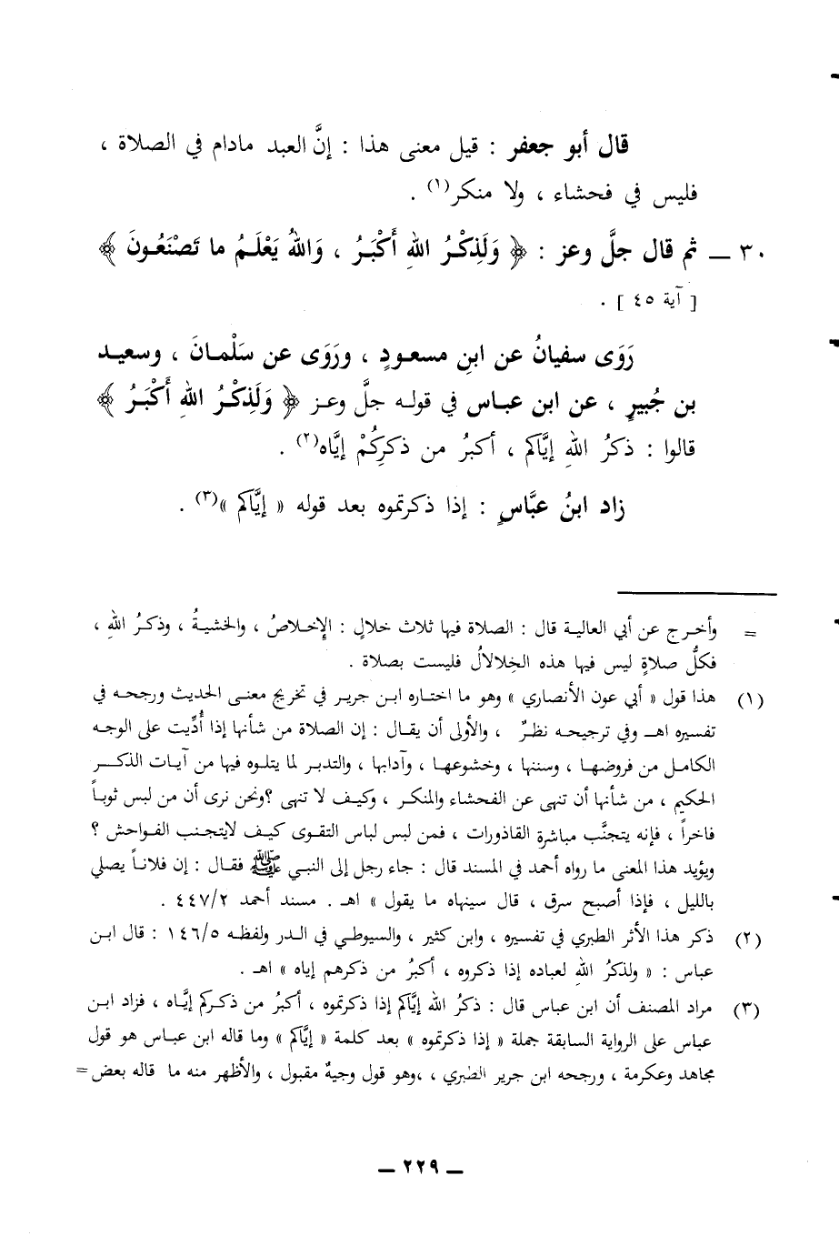 قال أبو جعفر قيل معنى هذا إن العبد مادام في الصلاة فليس في فحشاء ولا منكر 30 - ثم قال جل وعز ولذكر الله أكبر والله يعلم ما تصنعون روى سفيان عن ابن مسعود وروى عن سلمان وسعيد بن جبير عن ابن عباس في قوله جل وعز ولذكر الله أكبر قالوا ذكر الله إياكم أكبر من ذكركم إياه زاد ابن عباس إذا ذكرتموه بعد قوله إياكم